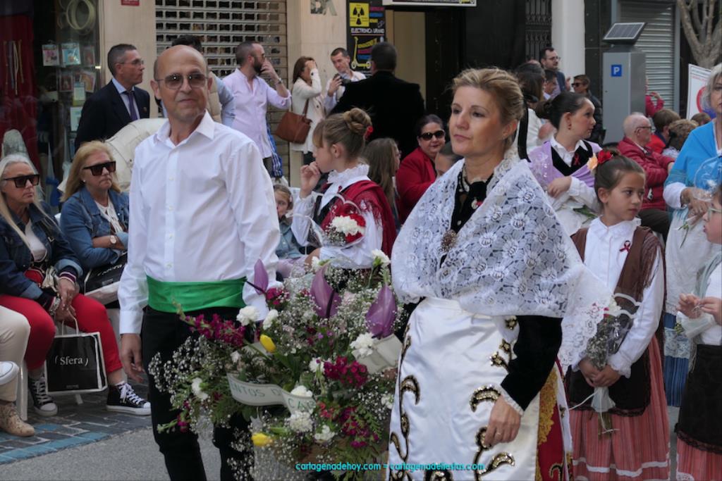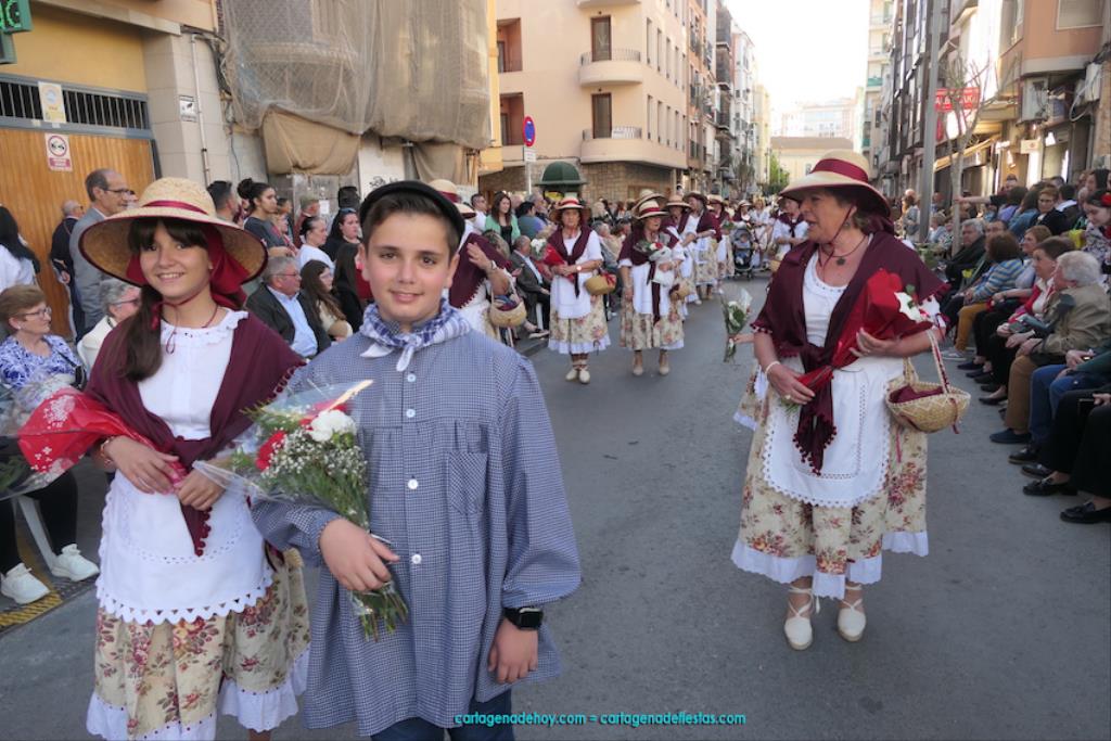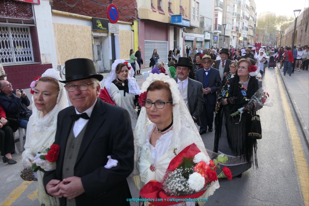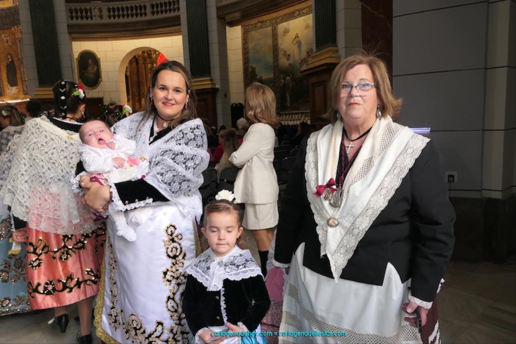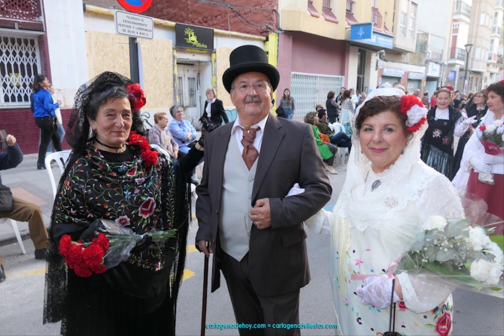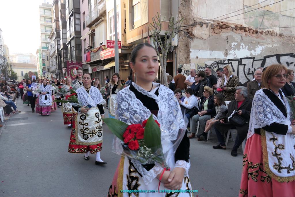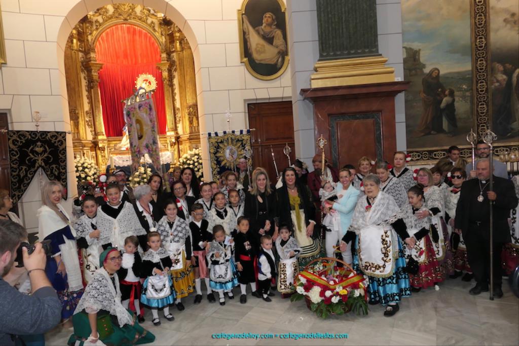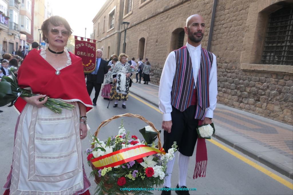 Isabel es un ejemplo de la devoción que existe hacia la patrona y a buen seguro que habrá más casos similares. Así, por ejemplo, Ana de Haro, presidenta vecinal del Ensanche-Almarjal, supera las cuatro décadas de ofrendas. En la lado opuesto hemos podido ver a muchos bebés con escasas semanas, meses o años de vida, y entre medio, un amplio ramillete de edades.Han sido cincuenta los grupos que ha protagonizado el mayor desfile popular de Cartagena cada año, que son los que aparecen en la relación adjunta más el partido 'Sí Cartagena'. También figura MC, con los ediles María José Soler y Jesús Giménez, entre otros de su formación, portando un escudo floreado de Cartagena, mientras que José López iba con la Cuarentuna. Otro candidato a alcalde, el socialista Manuel Torres, por su parte, llevaba el ancla que abría paso al grupo de vecinos de Santa Lucía, con amplia presencia de pescadoras. Por su parte, el gobierno municipal ha sido el segundo grupo que ha efectuado la ofrenda, con la alcaldesa luciendo típico traje cartagenero, al igual que Diego Ortega.
