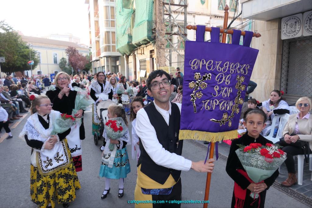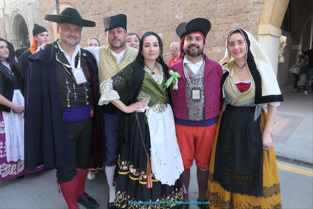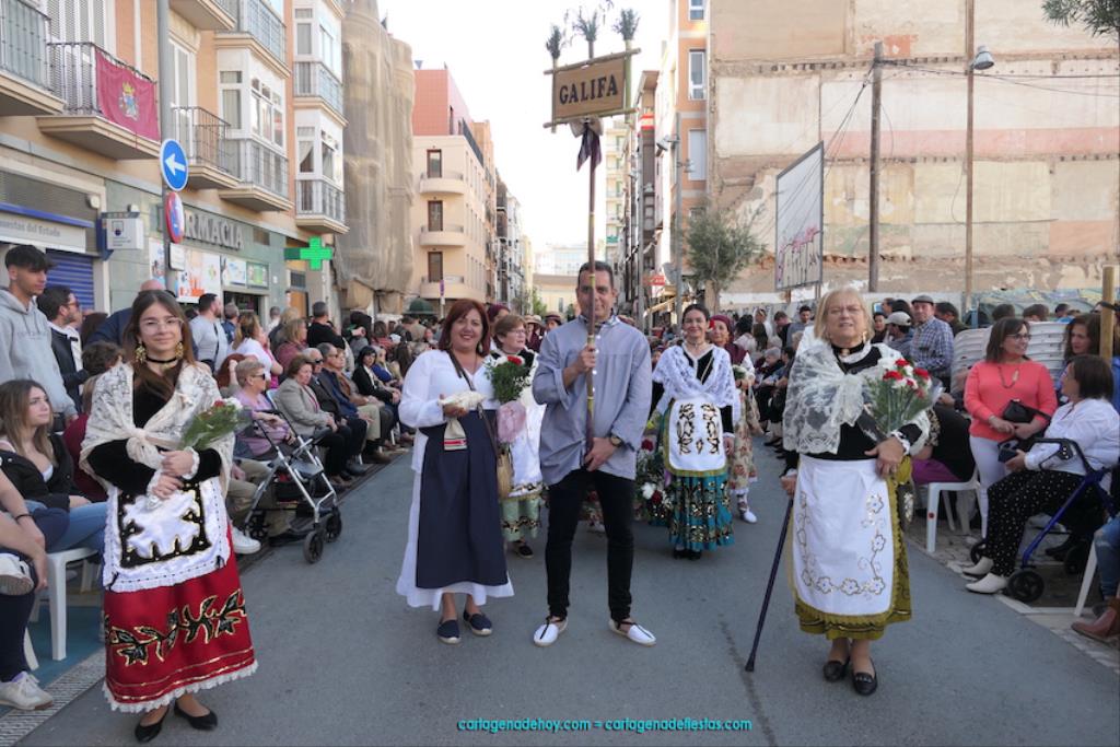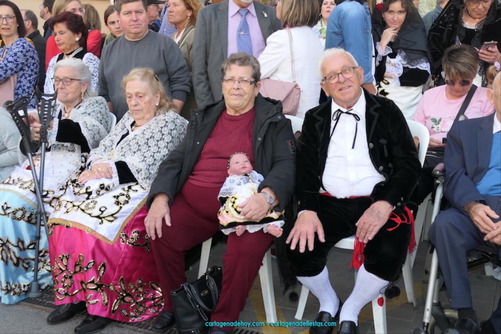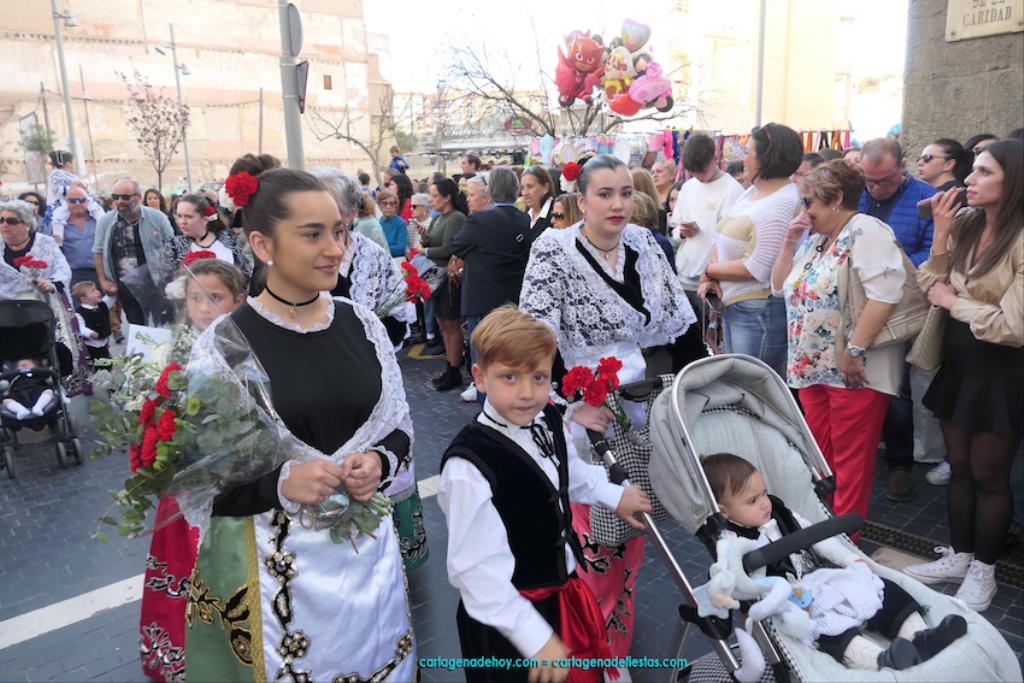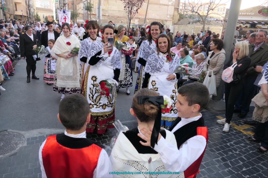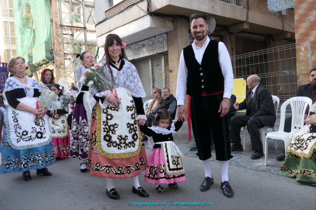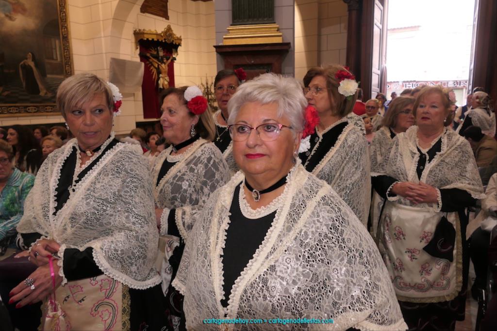 Isabel es un ejemplo de la devoción que existe hacia la patrona y a buen seguro que habrá más casos similares. Así, por ejemplo, Ana de Haro, presidenta vecinal del Ensanche-Almarjal, supera las cuatro décadas de ofrendas. En la lado opuesto hemos podido ver a muchos bebés con escasas semanas, meses o años de vida, y entre medio, un amplio ramillete de edades.Han sido cincuenta los grupos que ha protagonizado el mayor desfile popular de Cartagena cada año, que son los que aparecen en la relación adjunta más el partido 'Sí Cartagena'. También figura MC, con los ediles María José Soler y Jesús Giménez, entre otros de su formación, portando un escudo floreado de Cartagena, mientras que José López iba con la Cuarentuna. Otro candidato a alcalde, el socialista Manuel Torres, por su parte, llevaba el ancla que abría paso al grupo de vecinos de Santa Lucía, con amplia presencia de pescadoras. Por su parte, el gobierno municipal ha sido el segundo grupo que ha efectuado la ofrenda, con la alcaldesa luciendo típico traje cartagenero, al igual que Diego Ortega.