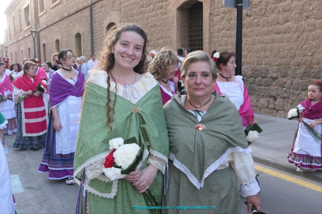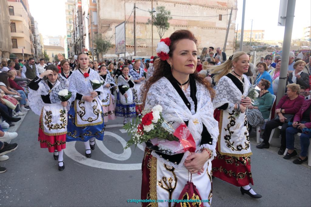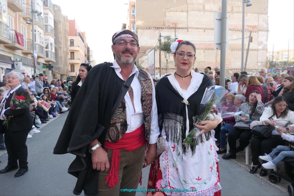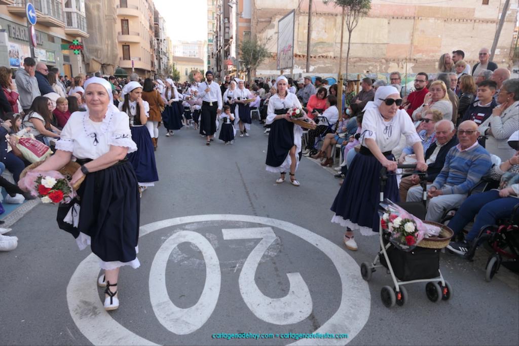 Cartagena se ha volcado con su patrona. Ya sin restricciones, unas dos mil personas han protagonizado el gran desfile de colectivos de todo el municipio. Entre ellas figuraba Isabel Quiñonero Miñarro, dentro del grupo de la Asociación de Vecinos de Torreciega, quien, con 90 años de edad, iba en una silla de ruedas empujada por su hija, Maribel Ruiz Quiñonero. Medio siglo lleva viniendo a la ofrenda floral con traje típico, según nos contaba. "No faltó nunca", añadía, indicando que, salvo los años de la pandemia, siempre ha acudido al encuentro con la Virgen de la Caridad, "y lo seguiré haciendo mientras viva". También comentaba que existe mucha diferencia de cuando empezó a acudir en los años setenta del pasado siglo a ahora, que es más multitudinario.