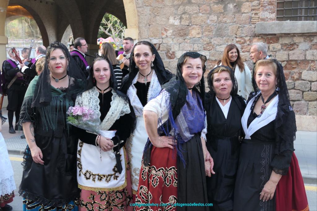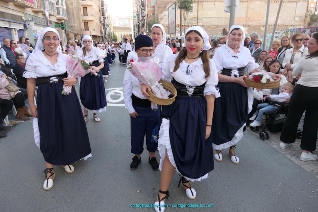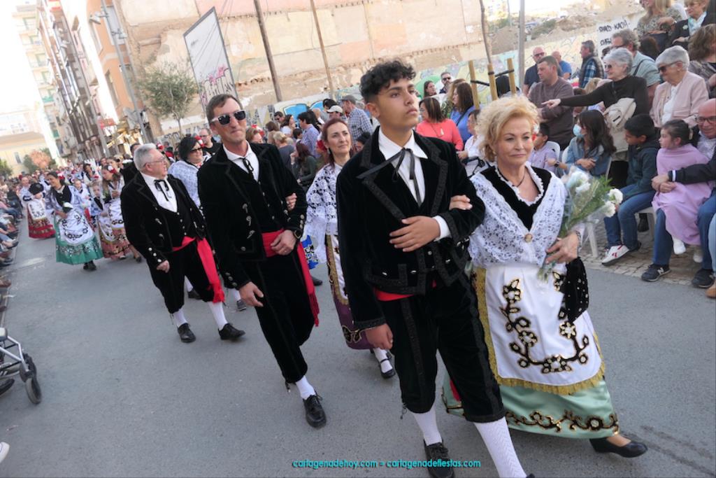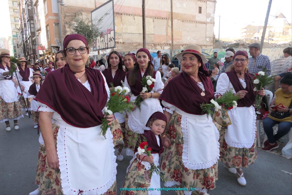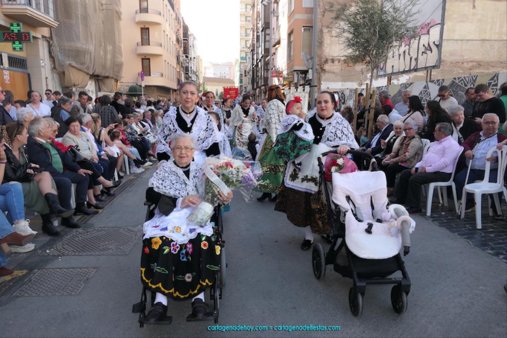 Cartagena se ha volcado con su patrona. Ya sin restricciones, unas dos mil personas han protagonizado el gran desfile de colectivos de todo el municipio. Entre ellas figuraba Isabel Quiñonero Miñarro, dentro del grupo de la Asociación de Vecinos de Torreciega, quien, con 90 años de edad, iba en una silla de ruedas empujada por su hija, Maribel Ruiz Quiñonero. Medio siglo lleva viniendo a la ofrenda floral con traje típico, según nos contaba. "No faltó nunca", añadía, indicando que, salvo los años de la pandemia, siempre ha acudido al encuentro con la Virgen de la Caridad, "y lo seguiré haciendo mientras viva". También comentaba que existe mucha diferencia de cuando empezó a acudir en los años setenta del pasado siglo a ahora, que es más multitudinario.