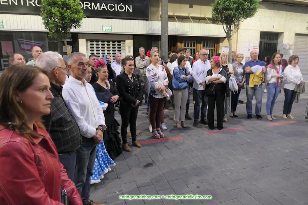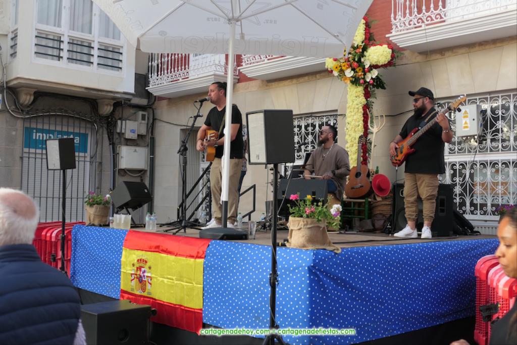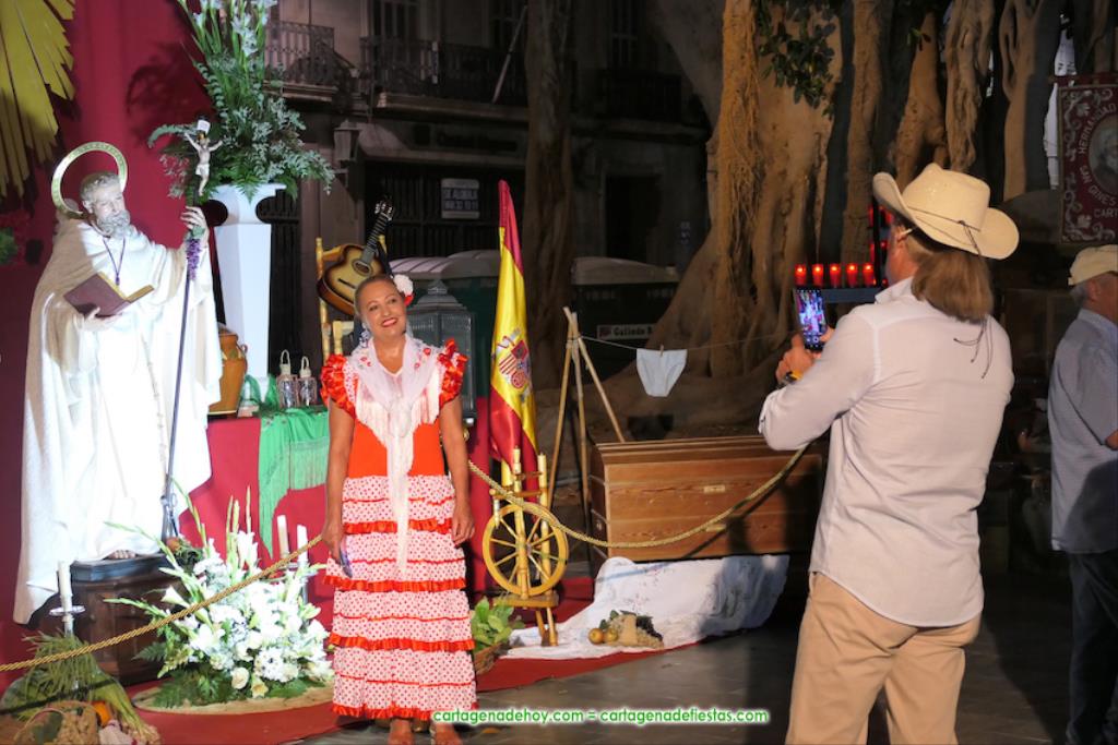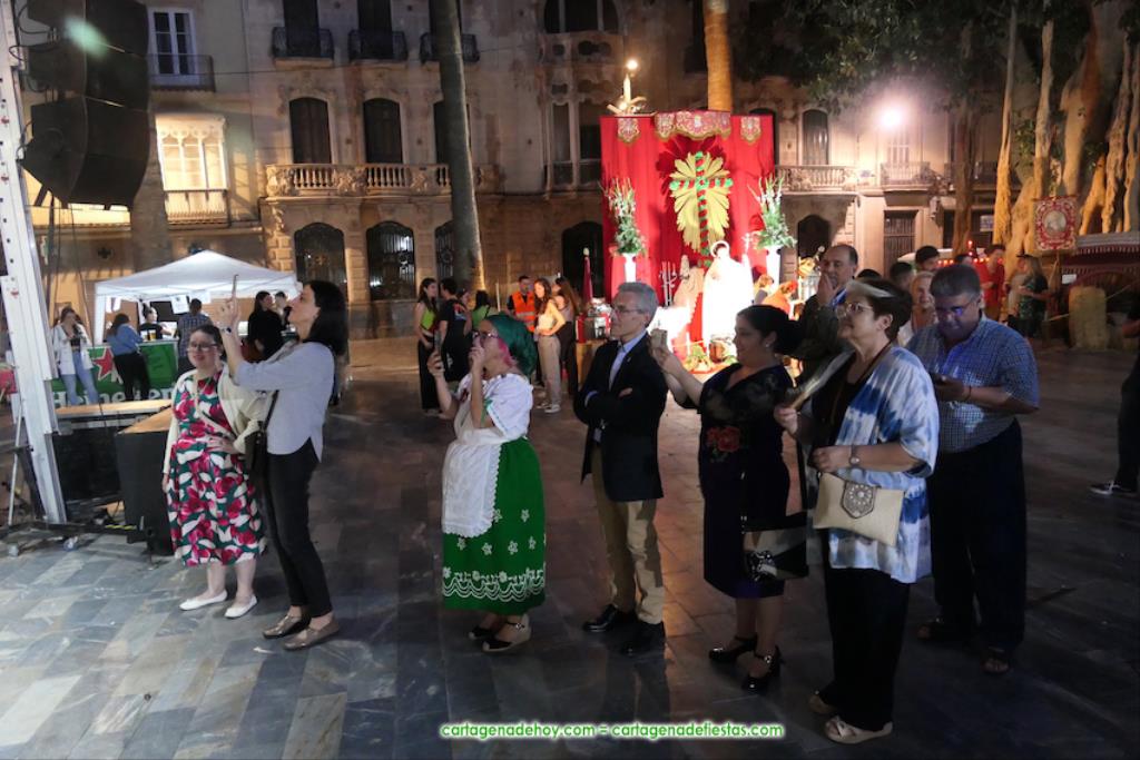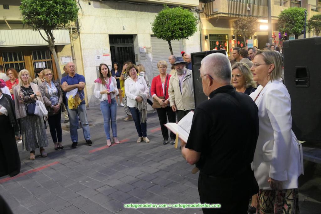 A la misma hora, en la glorieta de San Francisco, comenzaba el acto de inauguración de la Hermandad de Romeros de San Ginés de sus cruces, pues están la floreada y la de velas, siempre con elementos del campo cartagenero. Por cierto, junto a esta última hay tendida una braga de 'ama de casa de toda la vida'. José María Alcalde abrió el acto diciendo que los romeros "son sembradores de paz y alegría". El capellán, Lázaro Gomariz, acompañado por el sacerdote ortodoxo de la comunidad ucraniana en Cartagena, Andriy Chornopyskyy, llevó a cabo la bendición, para a continuación ofrecer un pregón 'con aroma de azahar' la procesionista Rosario del Carmen García Romero, que comenzó con una poesía y enlazó en su oratoria esta tradición con el sentimiento.