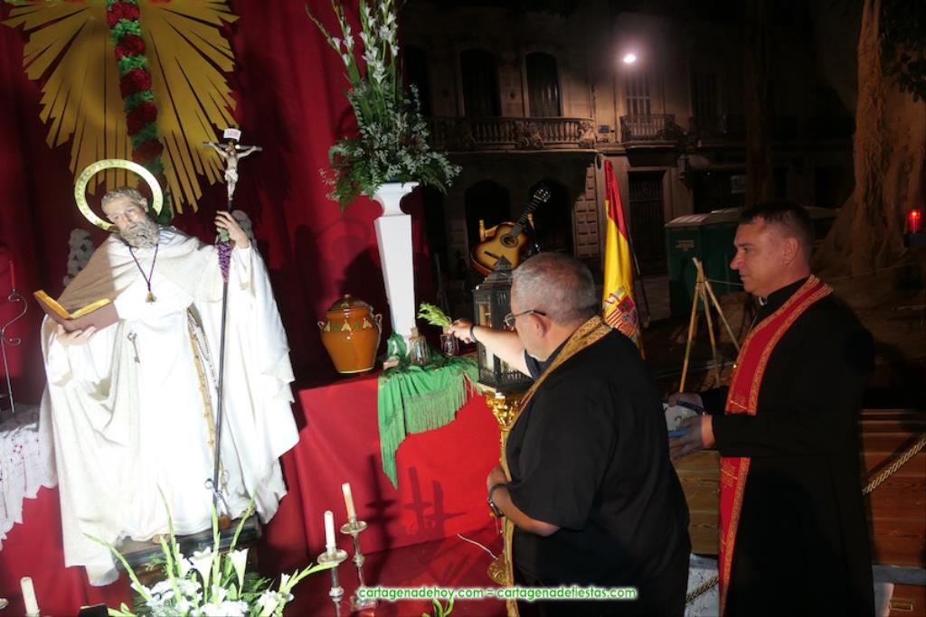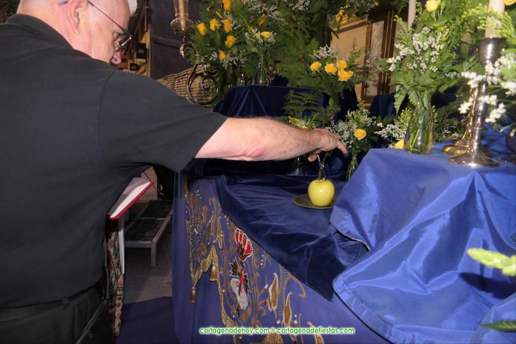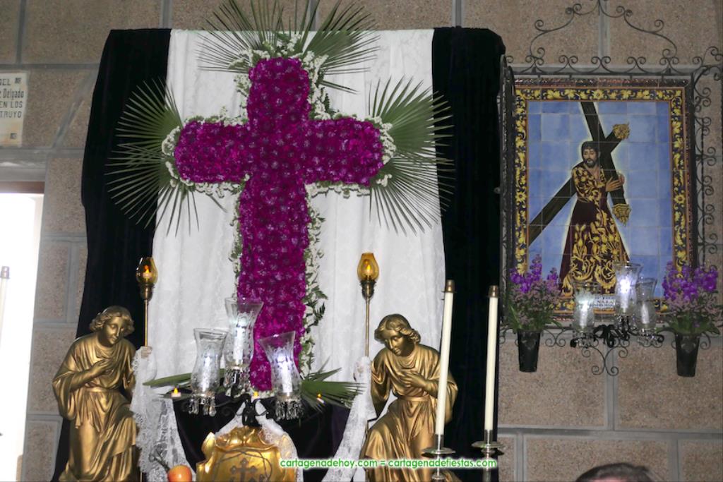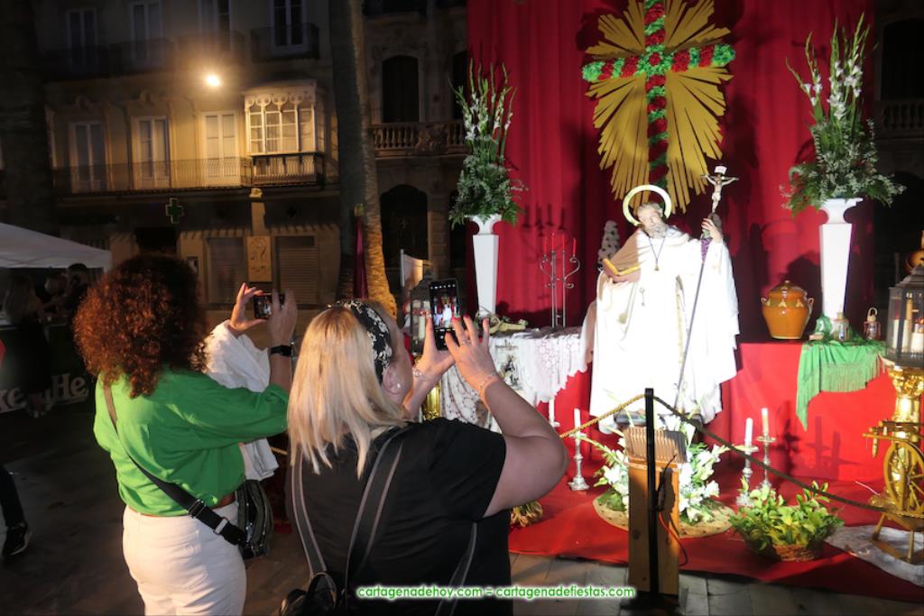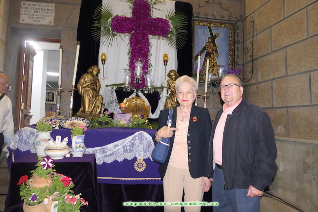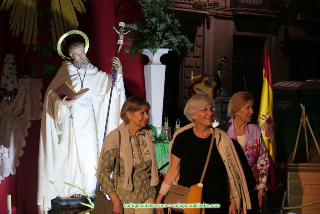 A la misma hora, en la glorieta de San Francisco, comenzaba el acto de inauguración de la Hermandad de Romeros de San Ginés de sus cruces, pues están la floreada y la de velas, siempre con elementos del campo cartagenero. Por cierto, junto a esta última hay tendida una braga de 'ama de casa de toda la vida'. José María Alcalde abrió el acto diciendo que los romeros "son sembradores de paz y alegría". El capellán, Lázaro Gomariz, acompañado por el sacerdote ortodoxo de la comunidad ucraniana en Cartagena, Andriy Chornopyskyy, llevó a cabo la bendición, para a continuación ofrecer un pregón 'con aroma de azahar' la procesionista Rosario del Carmen García Romero, que comenzó con una poesía y enlazó en su oratoria esta tradición con el sentimiento.