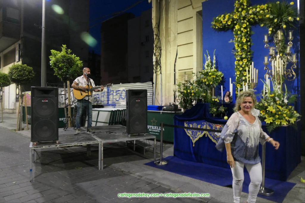 Después marchamos a calle Palas, donde el capellán de la hermandad, Miguel Solana, bendecía una muy primaveral cruz de la Cofradía de Jesús Resucitado, que está ubicada junto a un escenario donde minutos después comenzaban los directos. El propio sacerdote fue el encargado de clavar las tijeras en la manzana o pero, pues se sabe que así nadie podrá 'un pero' a la cruz.