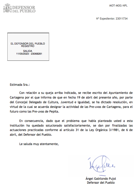 El Defensor del Pueblo comunica a la asociación Despierta CT la resolución del Ayuntamiento de Cartagena para la denominación en e futuro del evento 'Preuvas de Pepita'