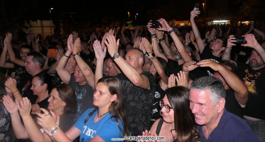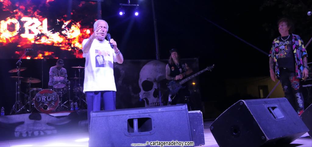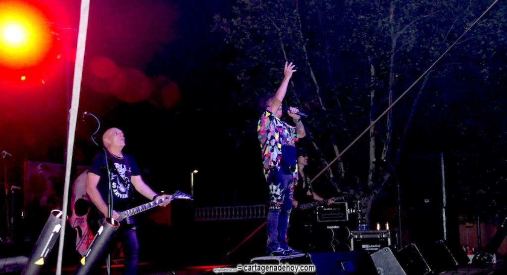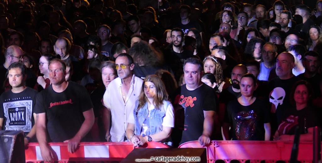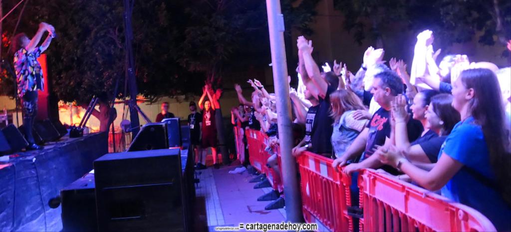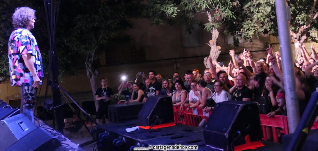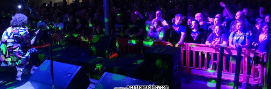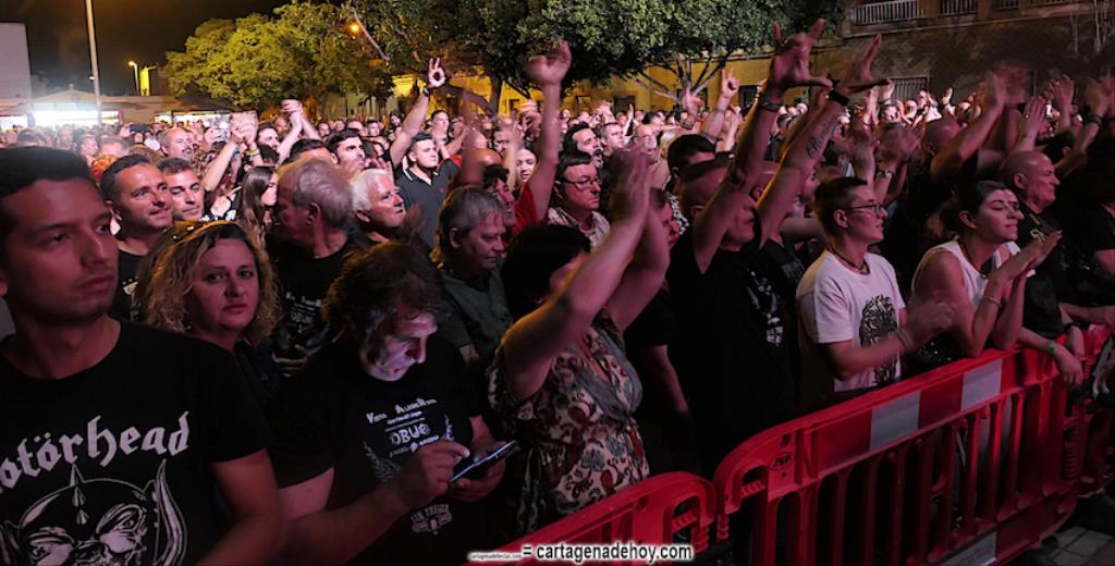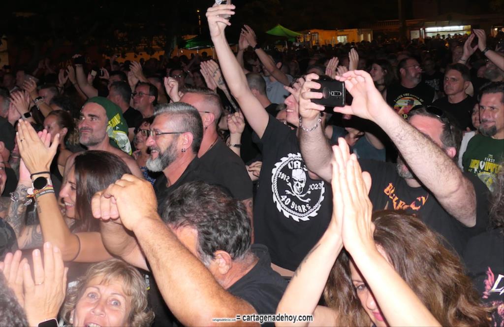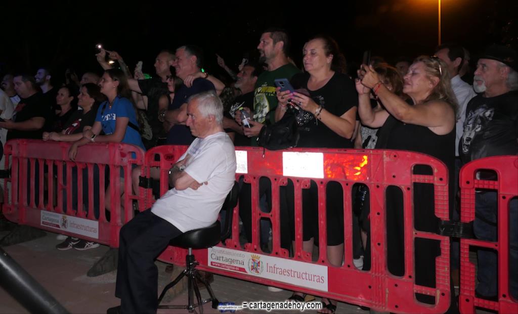 Vamos al capítulo musical, que comenzó sobre las diez y media de la noche y alcanzó las cuatro de una madrugada en la que, poco después, regresó la lluvia a Cartagena. Estupendas actuaciones de ‘Sin tregua’, ‘Sharabia’ y ‘Ángel Negro’, que también tienen a sus fieles conquistados merced a su buenhacer y calidad sonora, dentro de las variantes del rock que ofrecieron. Minutos antes de las dos de la madrugada apareció el cuarteto de ‘Obús’, siendo el último en subir al escenario un Fortu con camisa colorida, lo que contrastó en un ambiente donde la mayoría lucían las tradicionales camisetas negras. Comenzó con “Necesito más” y no faltó en su repertorio el súperconocido ‘Va a estallar el obús’ ni el ‘Dinero, dinero’ o el ‘Que te jodan’. Maestro sobre las tablas, fue puntal en mantener el júbilo entre el público. “¡¿Dónde estamos?!”, preguntaba a gritos. Unos decían que en Cartagena y otros que en Vista Alegre. Pues no… “¡Estamos en un concierto de rock…, arriba las manos!”.