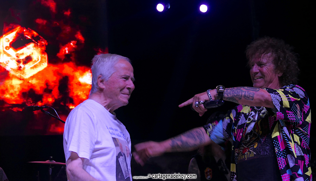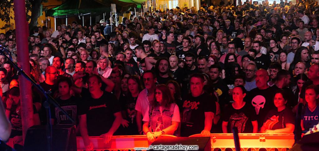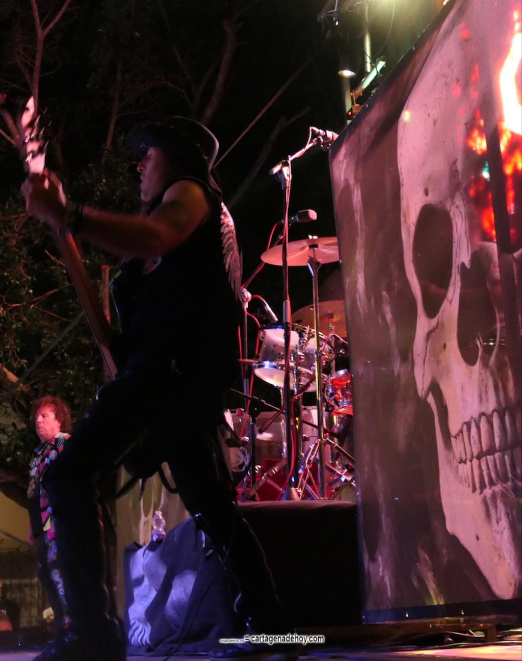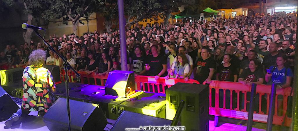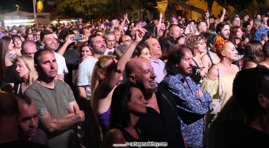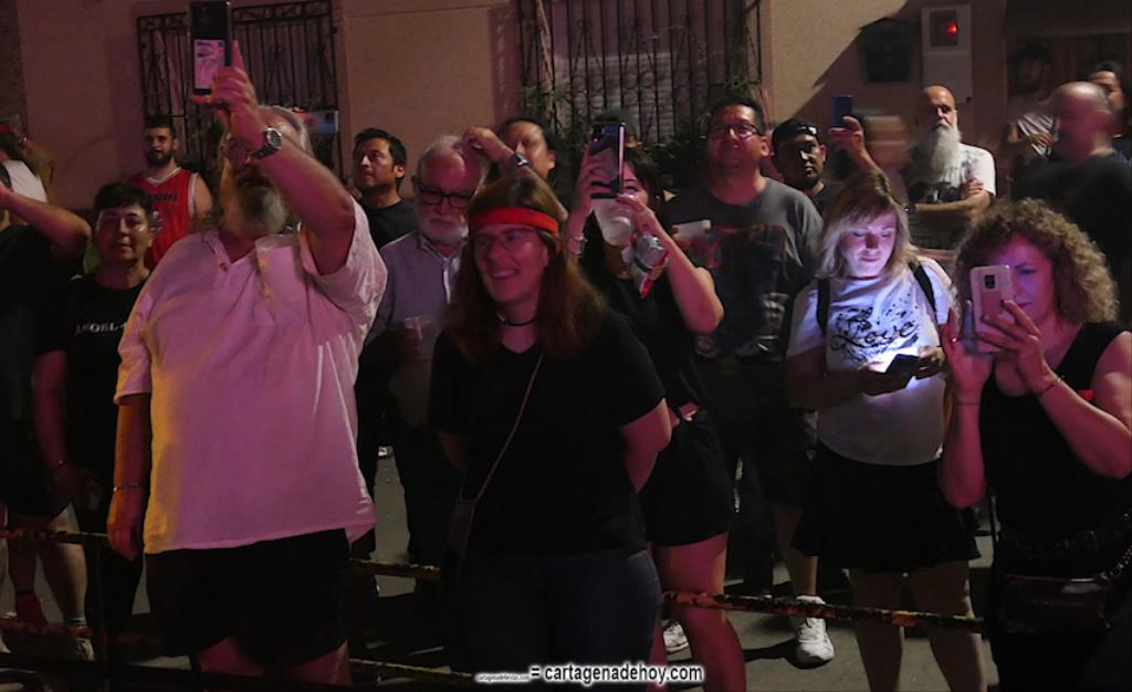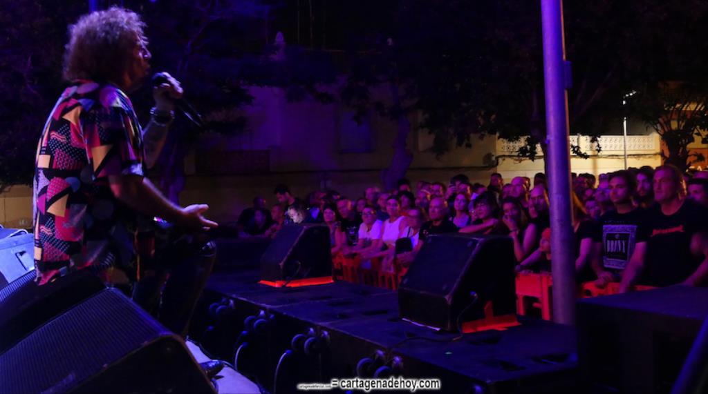 Vamos al capítulo musical, que comenzó sobre las diez y media de la noche y alcanzó las cuatro de una madrugada en la que, poco después, regresó la lluvia a Cartagena. Estupendas actuaciones de ‘Sin tregua’, ‘Sharabia’ y ‘Ángel Negro’, que también tienen a sus fieles conquistados merced a su buenhacer y calidad sonora, dentro de las variantes del rock que ofrecieron. Minutos antes de las dos de la madrugada apareció el cuarteto de ‘Obús’, siendo el último en subir al escenario un Fortu con camisa colorida, lo que contrastó en un ambiente donde la mayoría lucían las tradicionales camisetas negras. Comenzó con “Necesito más” y no faltó en su repertorio el súperconocido ‘Va a estallar el obús’ ni el ‘Dinero, dinero’ o el ‘Que te jodan’. Maestro sobre las tablas, fue puntal en mantener el júbilo entre el público. “¡¿Dónde estamos?!”, preguntaba a gritos. Unos decían que en Cartagena y otros que en Vista Alegre. Pues no… “¡Estamos en un concierto de rock…, arriba las manos!”.