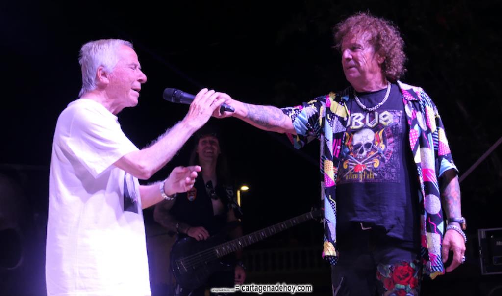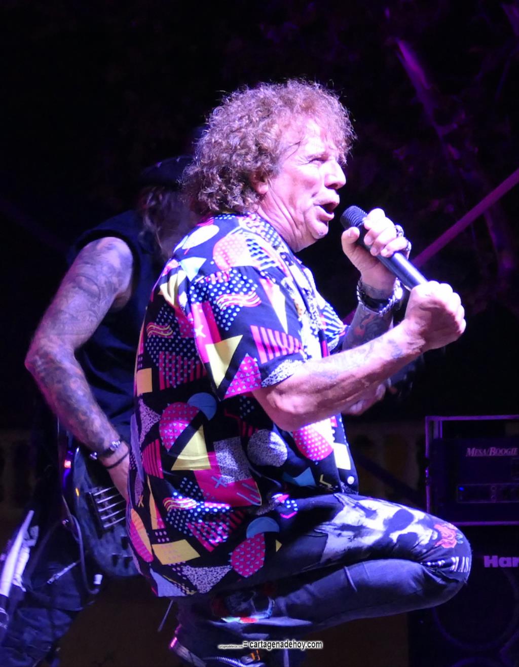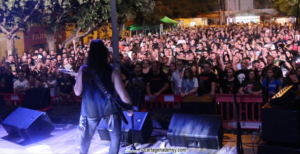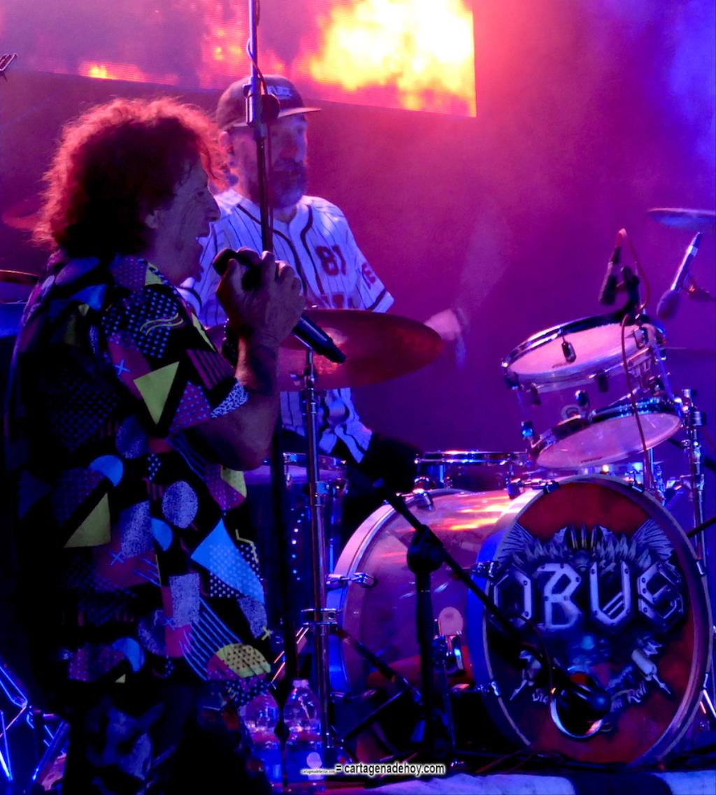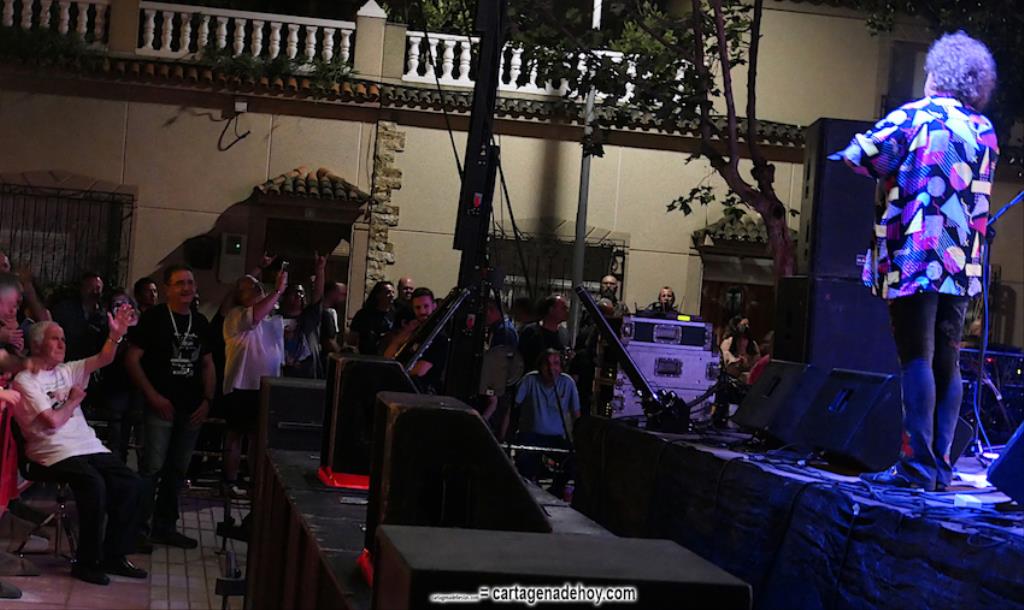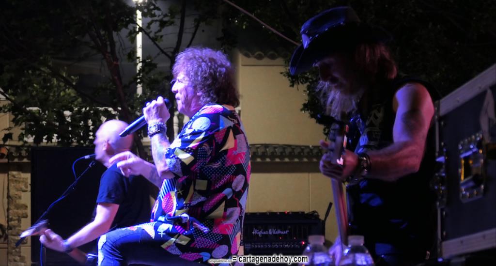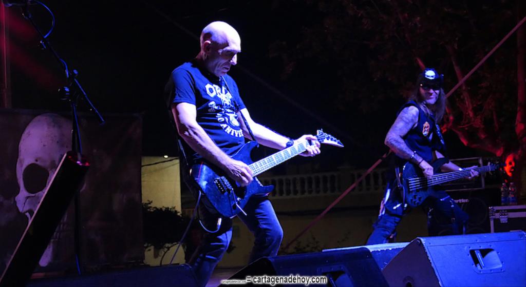 Vamos al capítulo musical, que comenzó sobre las diez y media de la noche y alcanzó las cuatro de una madrugada en la que, poco después, regresó la lluvia a Cartagena. Estupendas actuaciones de ‘Sin tregua’, ‘Sharabia’ y ‘Ángel Negro’, que también tienen a sus fieles conquistados merced a su buenhacer y calidad sonora, dentro de las variantes del rock que ofrecieron. Minutos antes de las dos de la madrugada apareció el cuarteto de ‘Obús’, siendo el último en subir al escenario un Fortu con camisa colorida, lo que contrastó en un ambiente donde la mayoría lucían las tradicionales camisetas negras. Comenzó con “Necesito más” y no faltó en su repertorio el súperconocido ‘Va a estallar el obús’ ni el ‘Dinero, dinero’ o el ‘Que te jodan’. Maestro sobre las tablas, fue puntal en mantener el júbilo entre el público. “¡¿Dónde estamos?!”, preguntaba a gritos. Unos decían que en Cartagena y otros que en Vista Alegre. Pues no… “¡Estamos en un concierto de rock…, arriba las manos!”.
