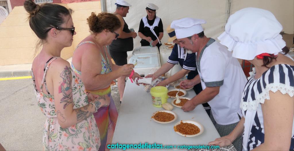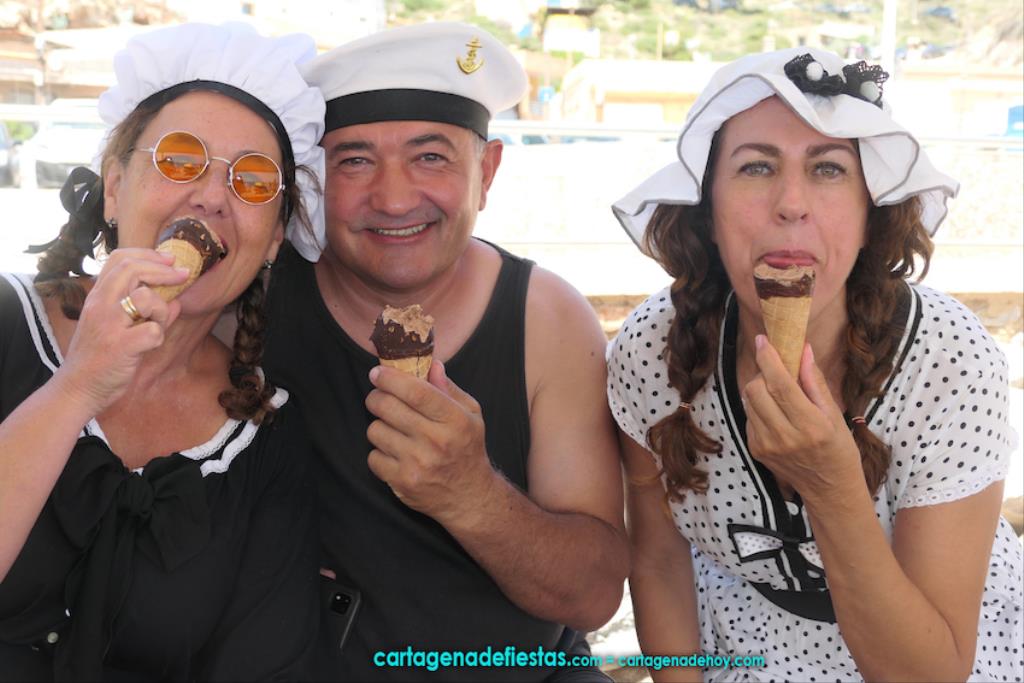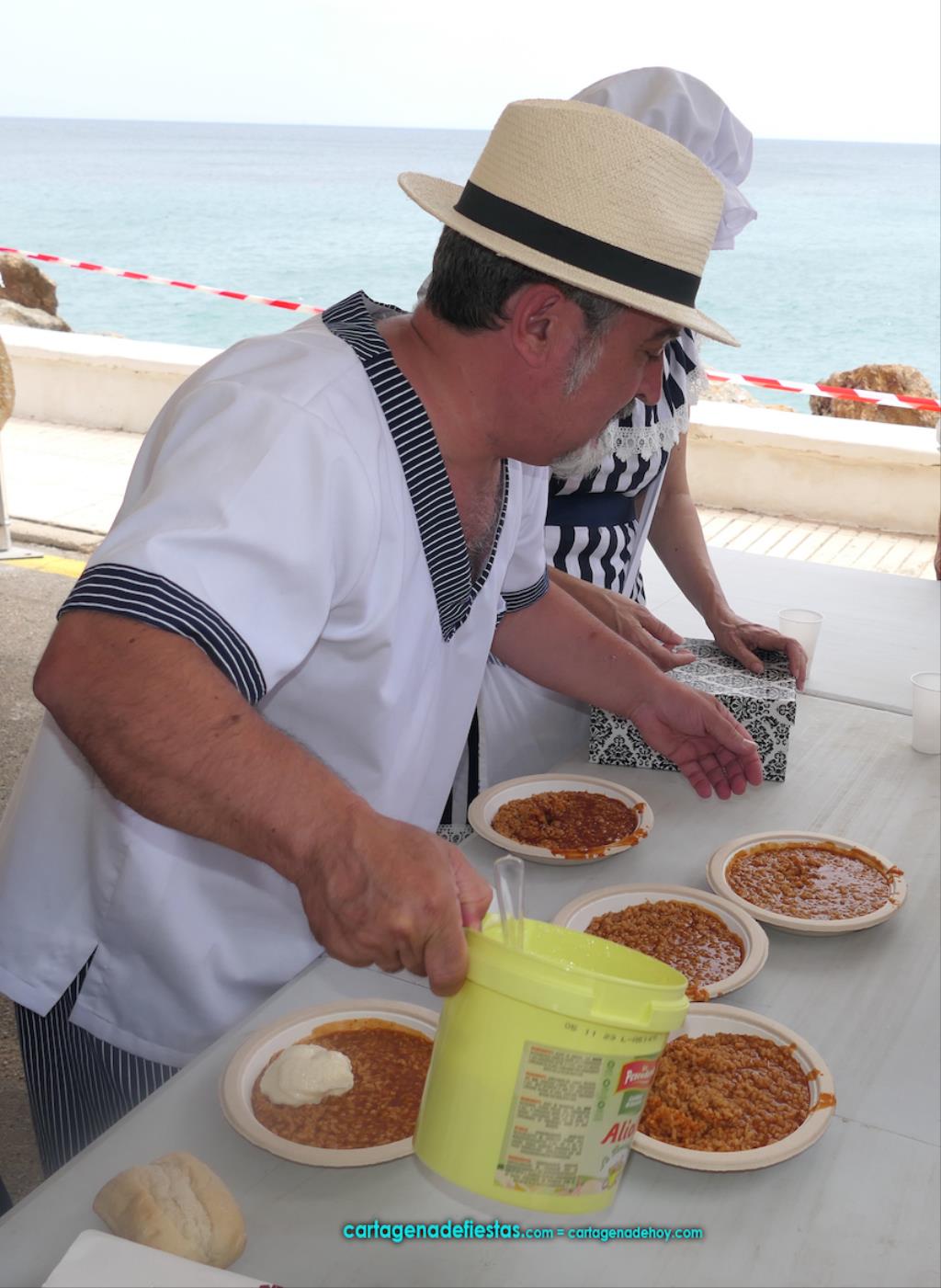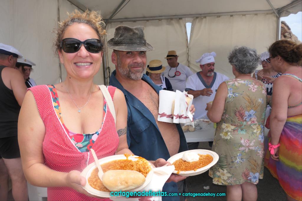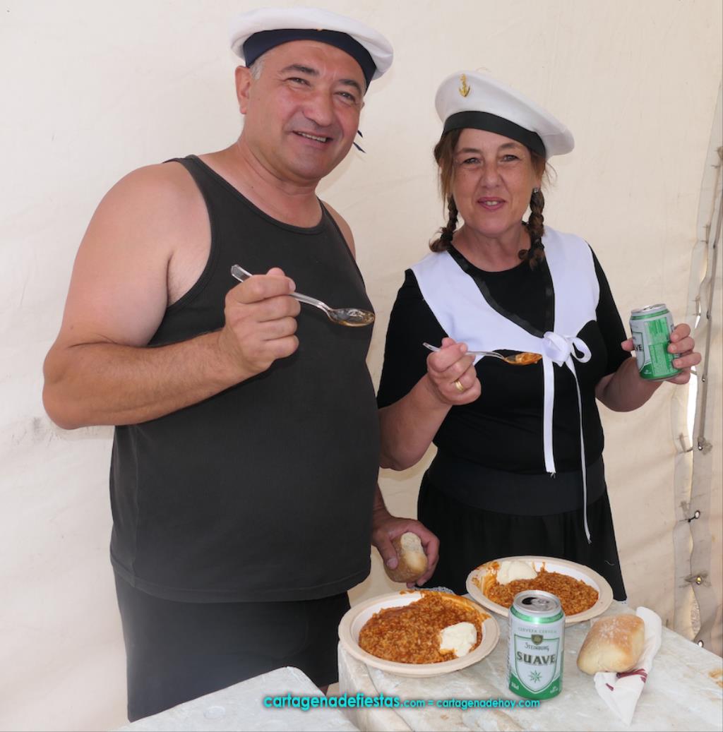 El sábado hubo 'pepitos modernistas' y el domingo tocó el turno al caldero elaborado por José Antonio Martínez 'El Kachi', presidente de la Asociación Cultural Modernistas de Cartagena de Levante, organizadores de las jornadas en colaboración con la Asociación de Vecinos de El Portús y el Ayuntamiento de Cartagena. Se sirvieron en una carpa habilitada por cantina y cocina a precio módico para potenciar el ambiente de estas jornadas. También se saborearon las rosquillas que días atrás también aparecieron en la presencia de los modernistas en el televisivo 'Ailoviu' y, dado el calor, no faltaron los refrescantes helados.
