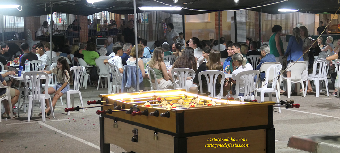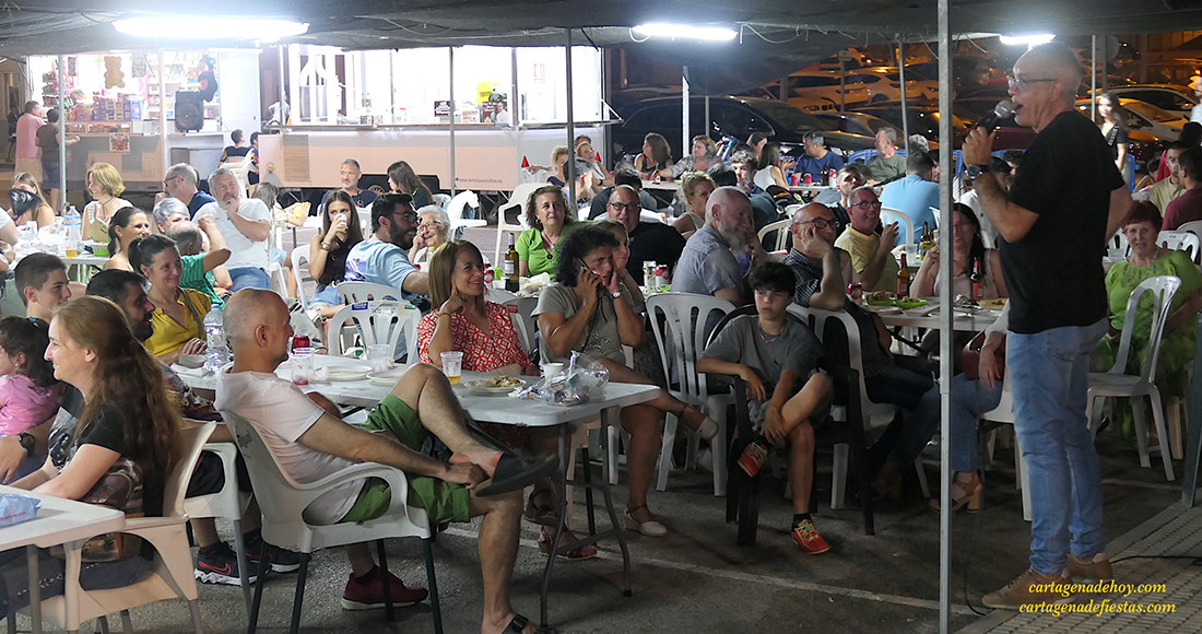 Las fiestas populares de la barriada cartagenera acogieron anoche una cena de convivencia de los vecinos que fue animada por el monólogo de Dani Mares y por música ambiental. Hoy es la jornada final, con actividad que comenzará a las 14 horas con una barbacoa (2 euros por plato) en un almuerzo con rifa familiar en la sobremesa, para por la tarde llegar las ‘Hadas purpurinas’ 19.30 horas) y el cierre con la actuación de ‘Aires de la calle’ (22 horas).