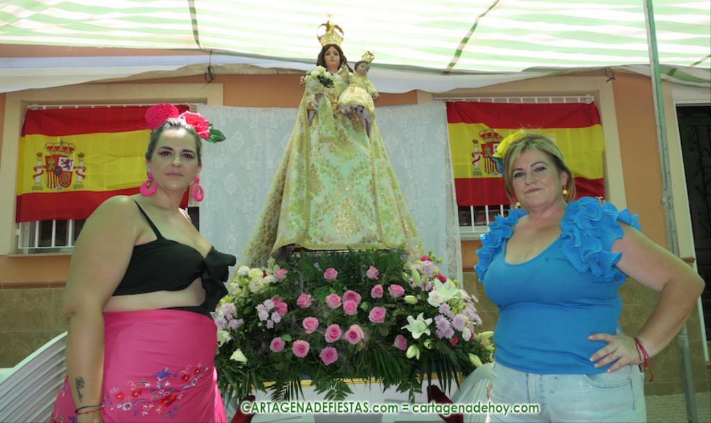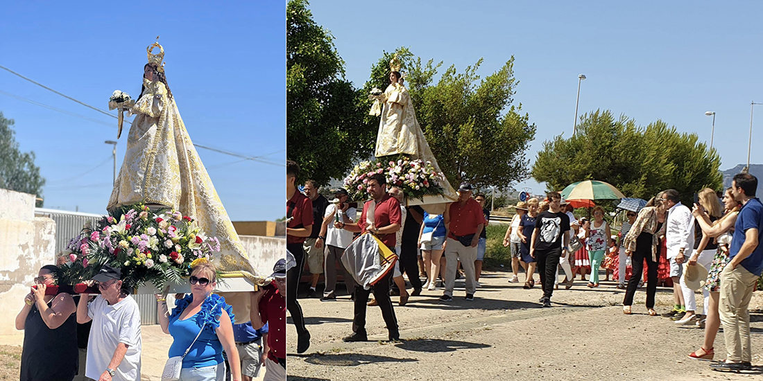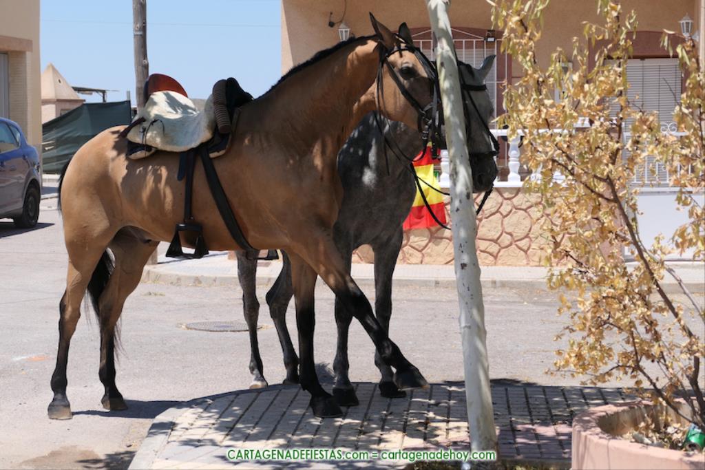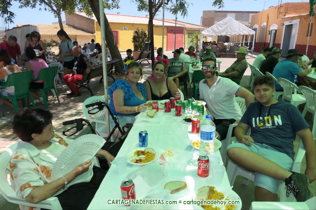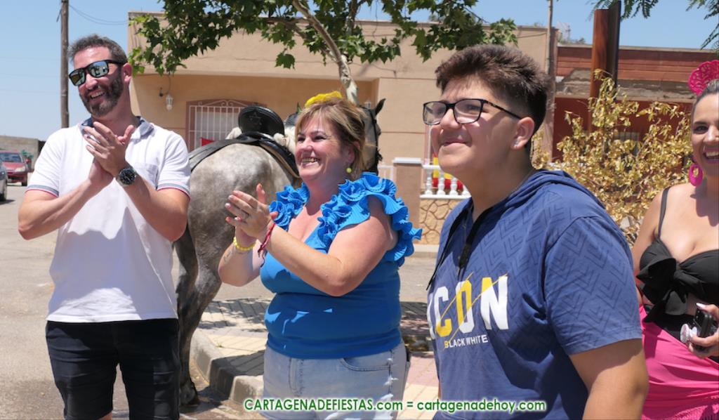 El domingo fue el día grande con la presencia de la Virgen, quien salió de la iglesia de La Guía en romería hacia la plaza del Pozo de los Palos ubicada junto al local de la asociación de vecinos, donde hubo almuerzo con morcillas, empanada gigante y 'muy buen rollo', como continuó después con un gigantesco arroz que compartieron de forma gratuita los asistentes, entre los que figuran representantes de Movimiento Ciudadano, entre los que figuraban José López y el edil Enrique Pérez, entre otros, quienes también llevaron a cabo el trayecto desde la iglesia hasta la plaza.La cartagenera Almudena Martínez 'Chiqui', popular desde que entró en el televisivo 'Gran hermano' en 2008, montando a caballo