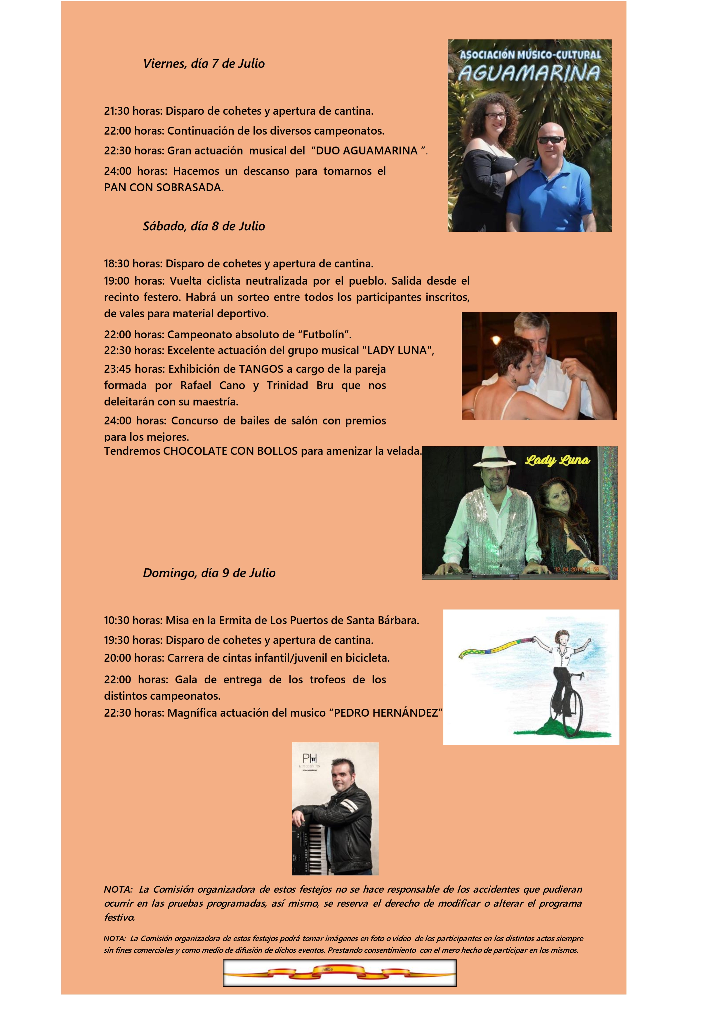 Los festejos que organiza la asociación de vecinos se estrenan hoy con la apertura del recinto festero, la actuación de Pedro Hernández y sorpresas, abriendo un programa que se prolongará hasta el día 9 y que acogerá, entre otros alicientes, variada música en directo, exhibición de tangos y concurso de baile, noche de migas y, entre otros, degustaciones de flores de novia, pan con sobrasada y chocolate de bollos.