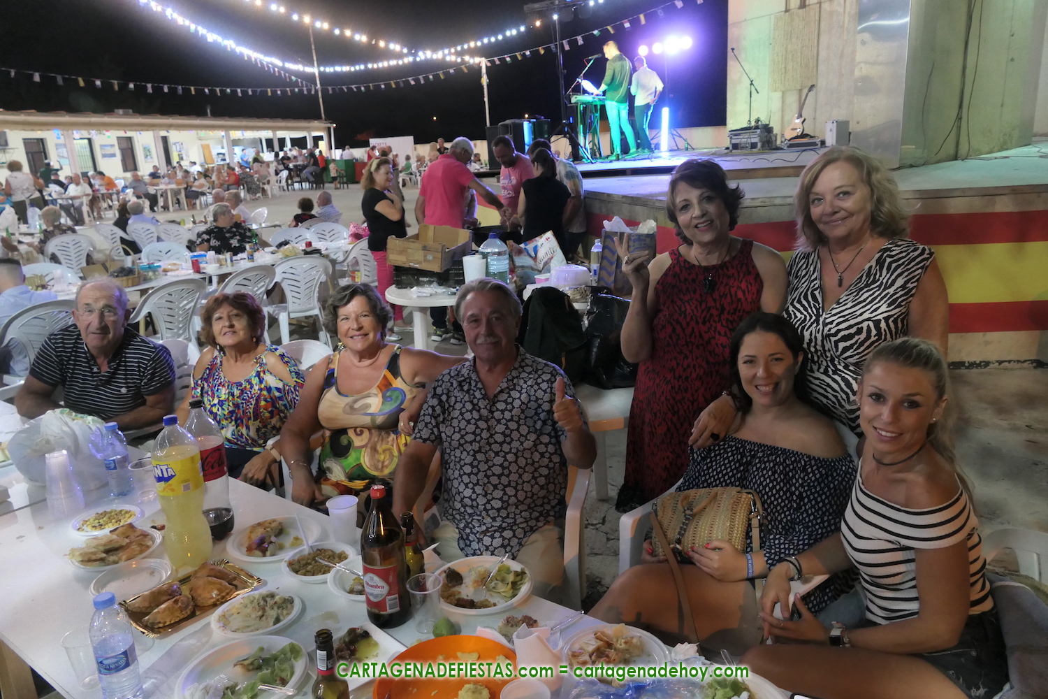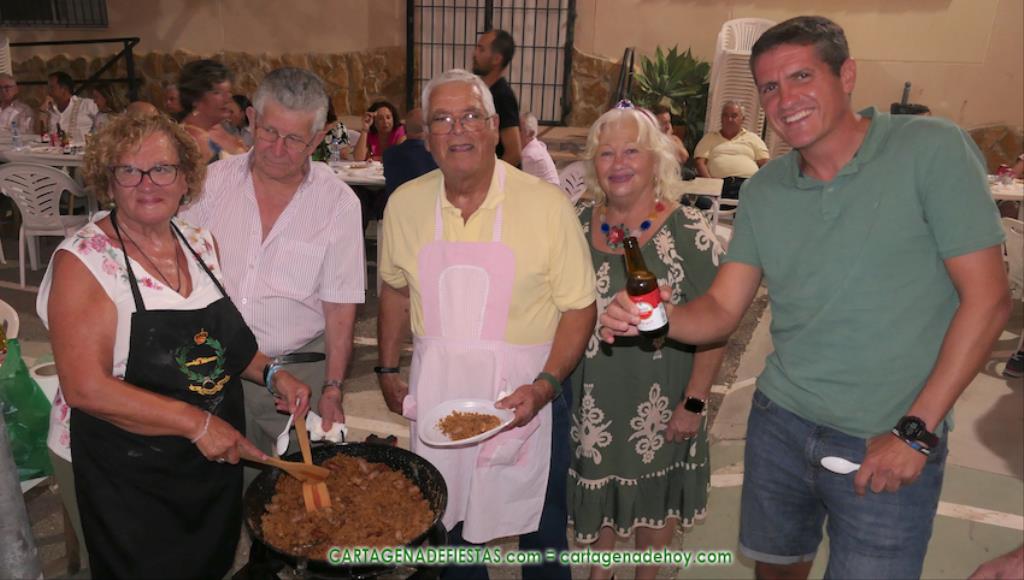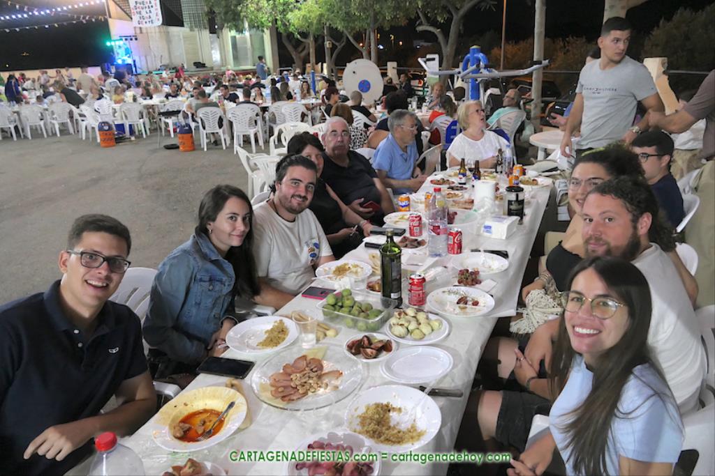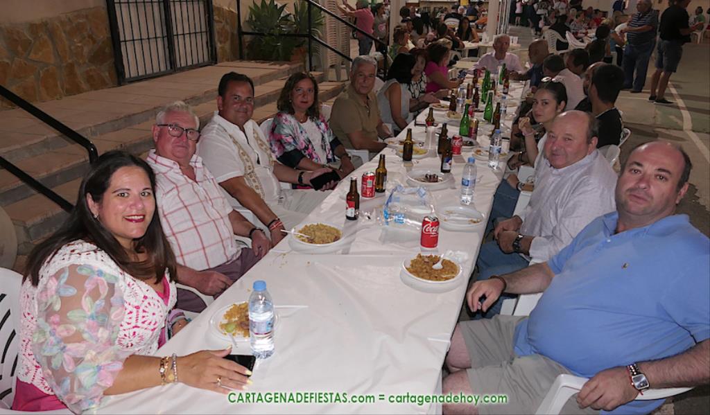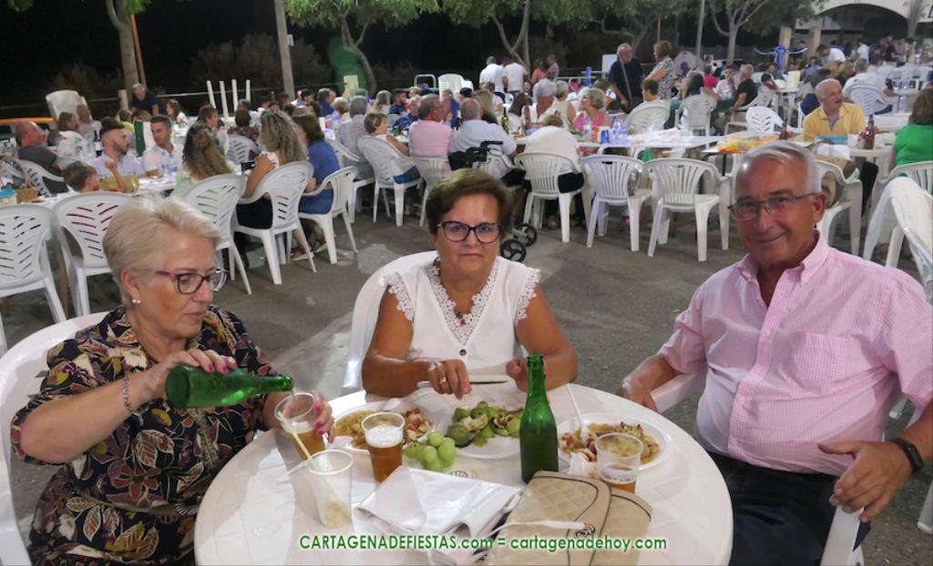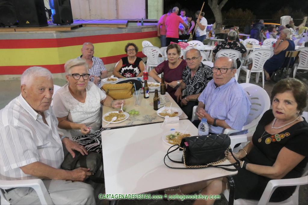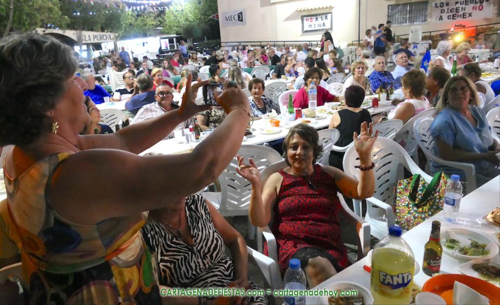 Las fiestas de los pueblos cartageneros y las migas van ligadas en la mayoría de ocasiones, convirtiendo los recintos festeros, en la mayoría de ocasiones, en gigantescos comedores donde manjares de todo tipo acompañan veladas en las que la harina elaborada con aceite, sal, longaniza, ajos y tocino, entre otros productos, es la reina. Anoche, junto al magnífico Museo Etnográfico, pudimos comprobarlo. Por un lado agradaba ver a jóvenes y mayores trabajar las migas con raseras, cucharas de madera y, en el caso del grupo de Molinos Marfagones, hasta con un gran remo. También nos llamó la atención María Lorente, quien, mientras meneaba las migas ruleras, nos decía que tiene 86 años y que fue hace 76 cuando hizo las primeras. No ha fallado desde entonces año alguno, ya sea en casa o en las fiestas, donde es fiel participante. Luego estaban los acompañamientos, como morcillas, empanadillas, sobrasada, queso, jamón, tortilla, etc. Vamos, un gran festín, que se vio aderezado por las bebidas que se dispensaban en la cantina o se traían de casa, como el buen vino que servía, con escarciador, Domingo, otro vecino de Los Puertos. También llamaban la atención los higos y uvas, que son buenos acompañamientos para tomar las migas, y los dulces, destacando los higos confitados que, con un aspecto estupendo, elaboró para anoche Tere.