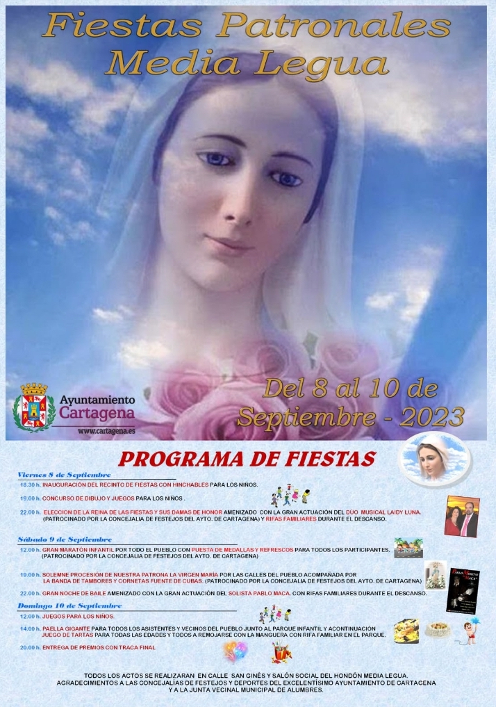 Las fiestas patronales se celebran desde este viernes y hasta el domingo, incluyendo en su programa como novedad una maratón infantil por el pueblo y el juego de tartas para todas las edades, además de la tradicional procesión con la Virgen, el arroz gigante, las actuaciones del cantante Pablo Maca y del dúo 'Leidy Luna' y la elección de la corte de honor, entre otras propuestas. Organiza la asociación de vecinos, a cuya presidenta, Antonia Morales, se observa acompañada de su esposo, Pepe Márquez 'El Cuco', colaborador del colectivo como vecino y artista musical.