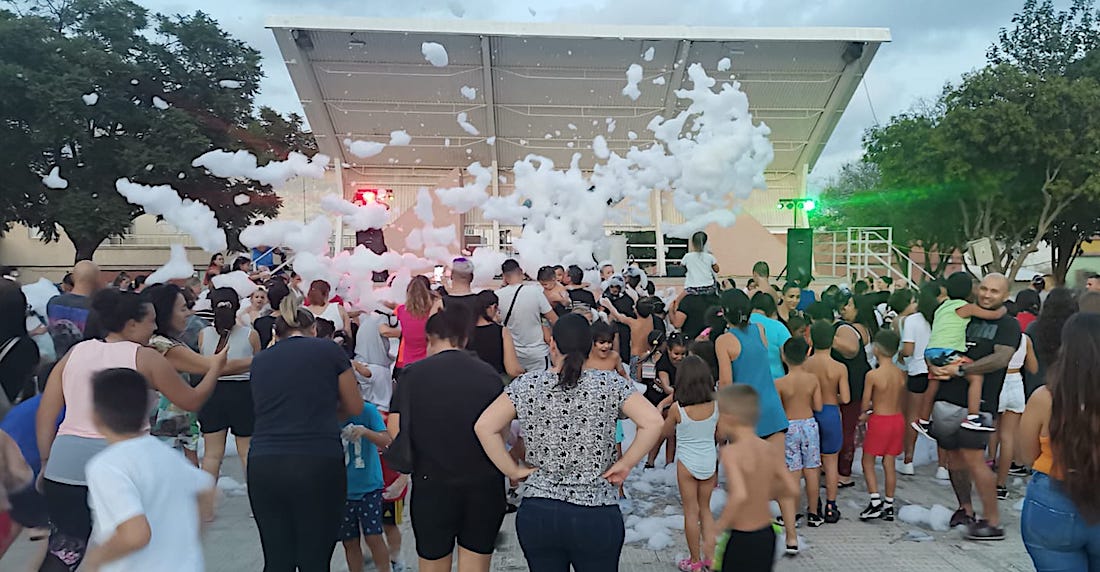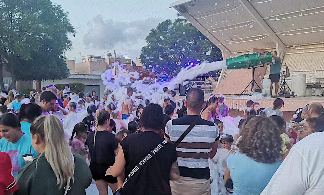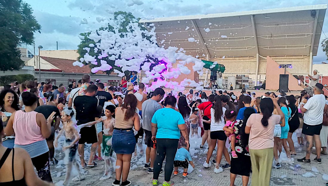 Los Dolores tuvo la jornada más multitudinaria de su inicio festero con la popular fiesta de la espuma en la plaza Virgen de los Dolores, donde hoy tiene lugar la apertura oficial de los festejos, además de rifa familiar y las actuaciones de 'Brisas del sur' y 'Trío Jema'.