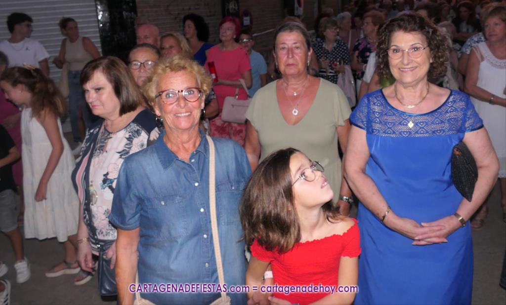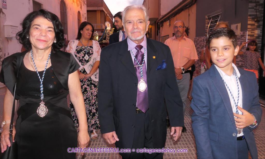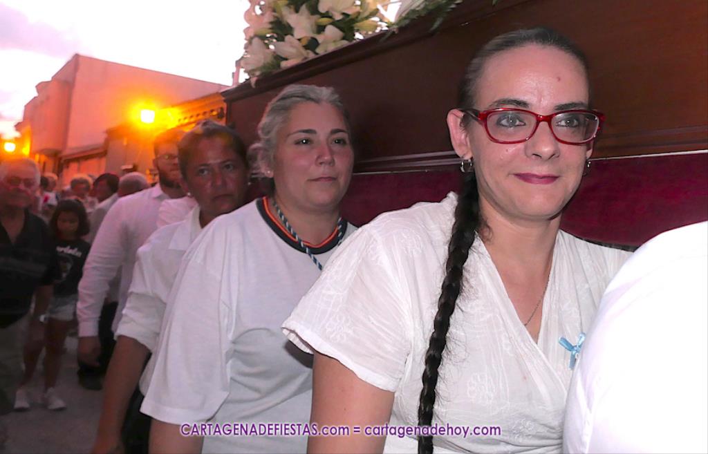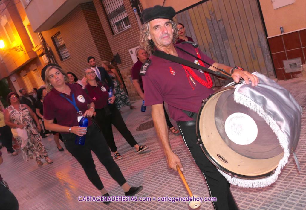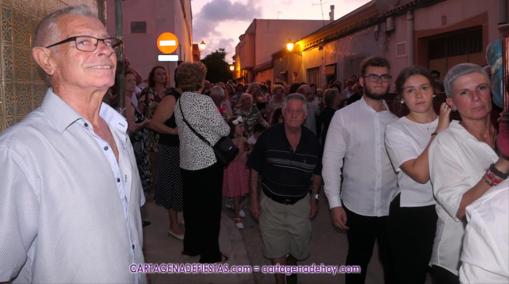 Pasadas las ocho de la tarde, y tras una jubilosa salida de su templo, el cortejo se puso en marcha por las calles del entorno de la vía principal del barrio, formando parte de la comitiva el párroco, Antonio José Palazón; los hermanos mayores de las hermandades de la Virgen de los Dolores, del Cristo de la Salud y de los romeros de San Ginés de la Jara, respectivamente, Salvador Vázquez, Ángel Valverde y Andrés García; el concejal de Cultura, Nacho Jáudenes; la presidenta de la Junta Vecinal Municipal, Julia Otón; el presidente de la Asociación de Vecinos de Los Dolores, Ángel Mario Ros; y la presidenta de Mujeres Cartagonova, Adela Gutiérrez, entre otros, siendo la banda de tambores y cornetas de Fuente de Cubas la que puso la música procesionista durante la marcha.