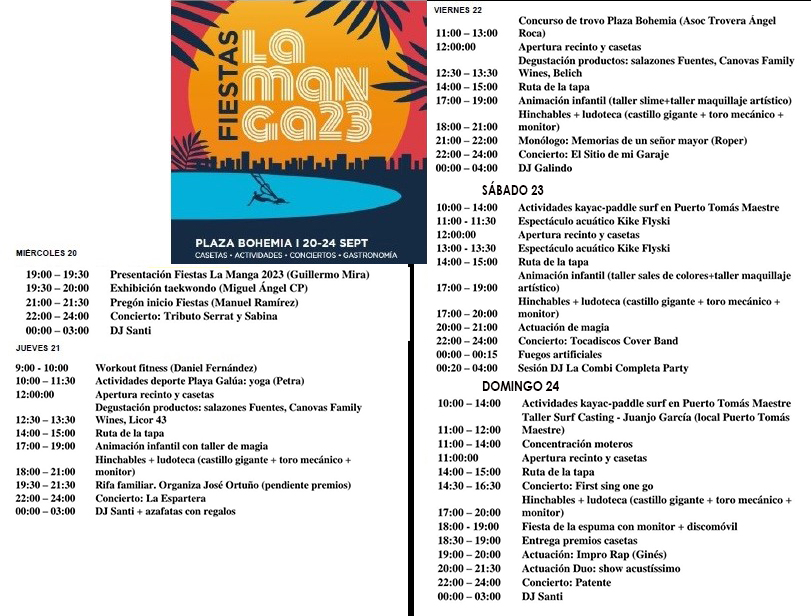 Manuel Ramírez será el pregonero de los festejos que comienzan el día 20 y que se prolongarán hasta el día 24 con la plaza Bohemia como epicentro y donde se ubicarán las casetas. Entre las propuestas están los tributos a Serraty Sabina, actuaciones de La Espartera, 'El sitio de mi garaje', 'Tocadiscos Cover Band', 'Patente', del rapero Ginés y de los 'pinchadiscos' Santi y La Combi, monólogo de Roper, degustación de salazones, hinchables, espectáculo acuático, ruta de la tapa, concentración motera con 'Sunday 24 Bikers Day', etc. Organizan los ayuntamientos de Cartagena y de San Javier junto a Consorcio de La Manga.