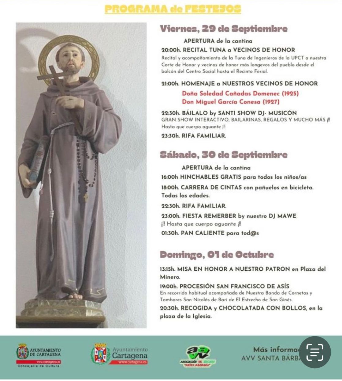 El programa arranca este viernes con un recital de tunos de la UPCT dedicada a la corte de honor y a los residentes más longevos del pueblo, para después se homenajeados los 'Vecinos de honor', que son Soledad Cañadas Domenec (nacida en 1925) y Miguel García Conesa (1927). La noche culmianrá con dj y rifa familiar. En los dos días siguienes hay diversas actividades para todas las edades, con procesión el domingo por la tarde.