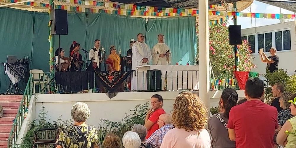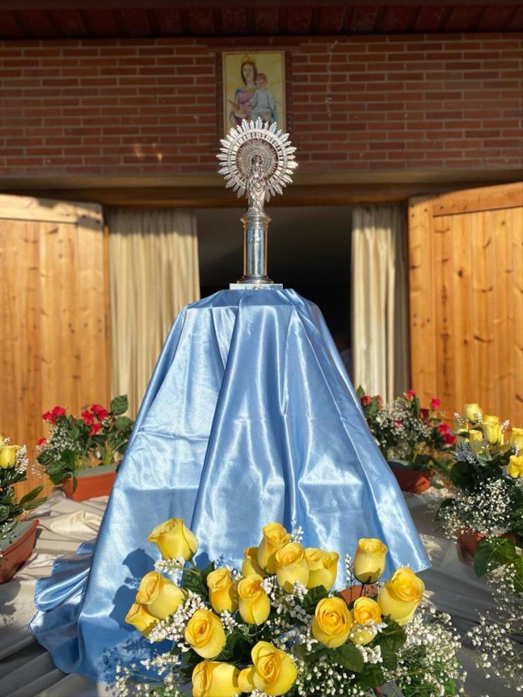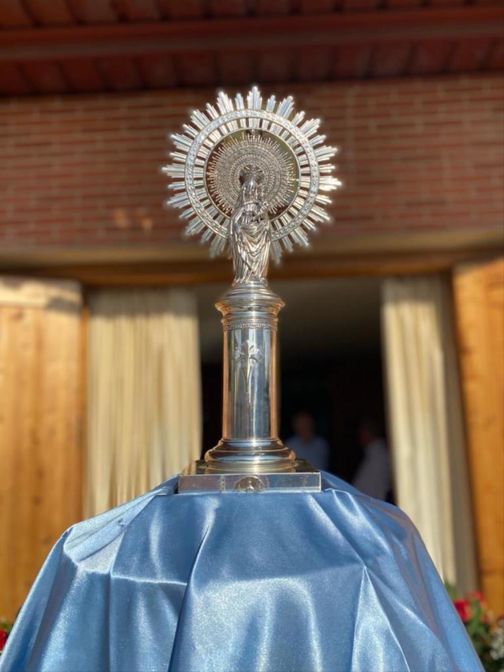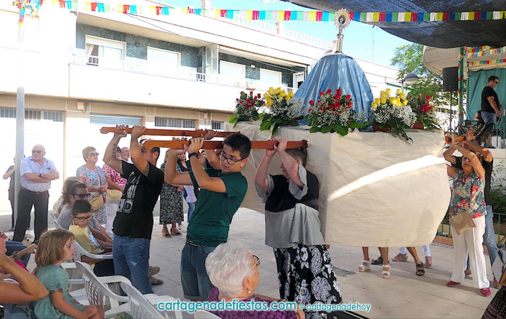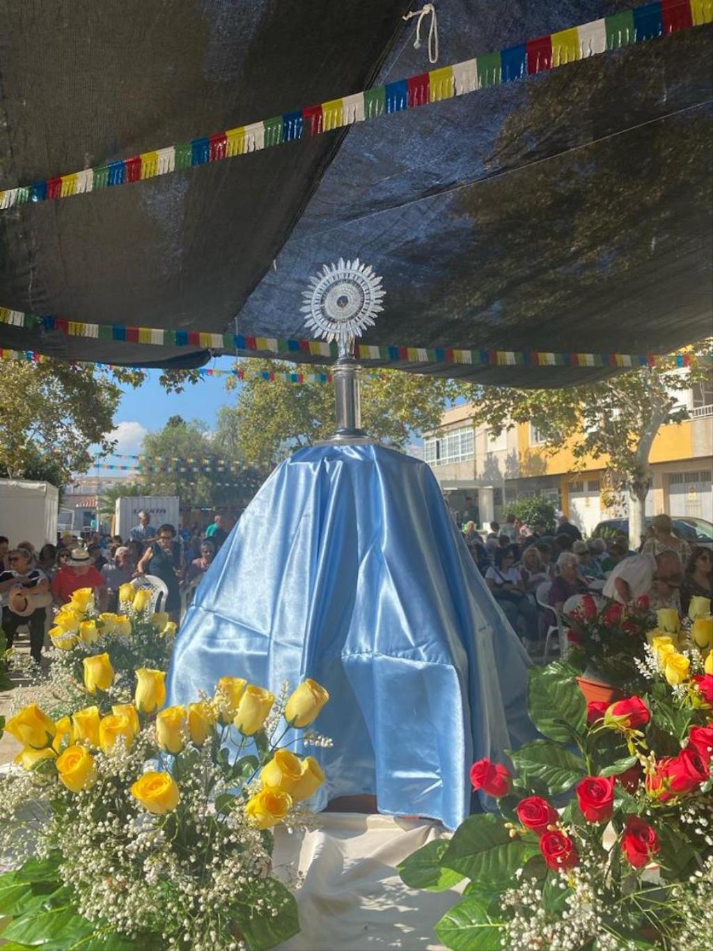 La pequeña talla de la también patrona de España salió a hombros sobre su peana desde la iglesia salesiana, recorriendo varias calles hasta llegar a la plaza de María Auxiliadora, recinto de las fiestas, donde fue izada por sus costaleros, para después celebrarse una misa oficiada por el párroco, José Sorando Sanz, la cual estuvo enriquecido por las voces y música del grupo rociero ‘Reina de las marismas’.