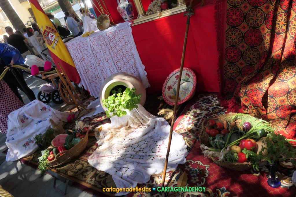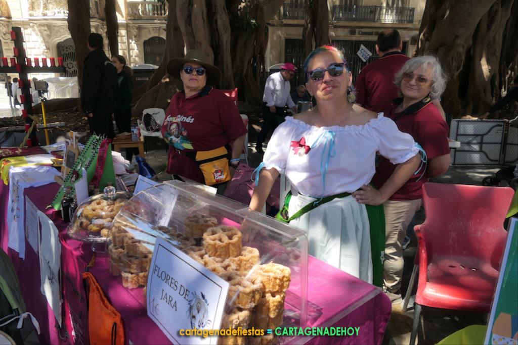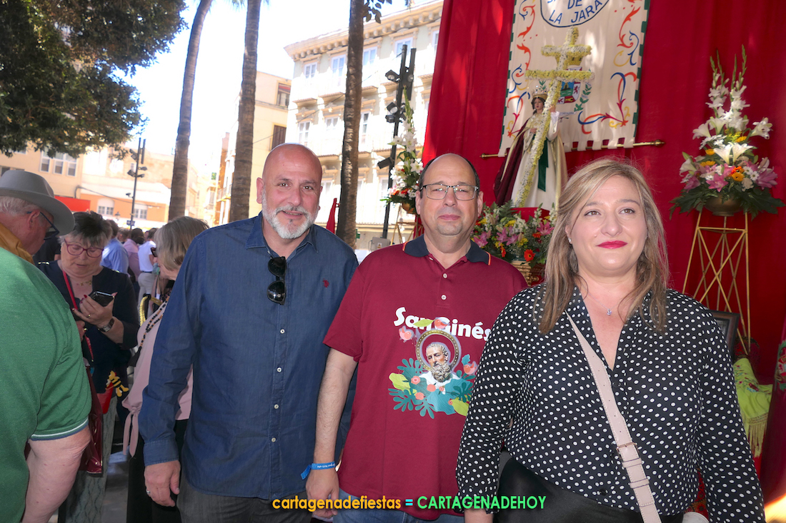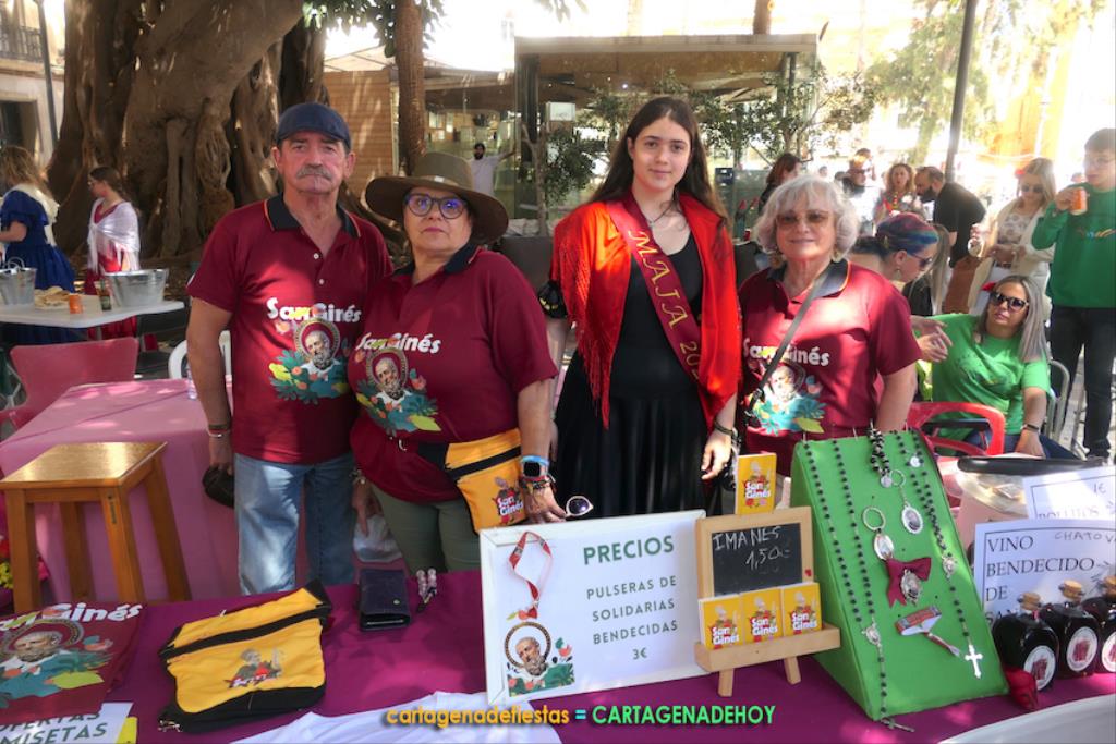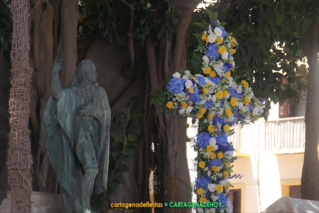 Bajos los ficus de la plaza está la cruz de la Hermandad de Romeros de San Ginés de la Jara, elaborado con flores silvestres amarillas y blancas (colores vaticanos) y que homeanaje a la Cruz de Caravaca (el domingo sacaremos un artículo monográfico), siendo el montaje enriquecido de elementos rurales. También hay una mesa donde se venden desde pulseras bendecidas hasta las dulces 'flores de la Jara'.