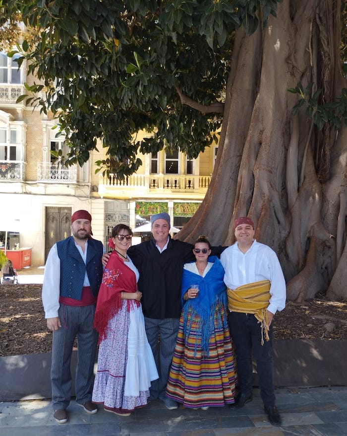 El quinteto ha estado, nuevamente, presente en las multitudinarias cruces de mayo del casco histórico cartagenero, como vienen haciendo, con el paréntesis pandémico, desde el año 2017, cuando se lanzaron a esta aventura, aparentemente, 'contra corriente'. "Pedro Antonio Gómez, presidente del Grupo Folclórico 'Ciudad de Cartagena' de La Palma, fue quien nos asesoró e informó de los atuendos más apropiados, pues nuestro propósito ha sido desde el principio ser fieles a nuestras tradiciones", explican sobre sus orígenes a este periódico.