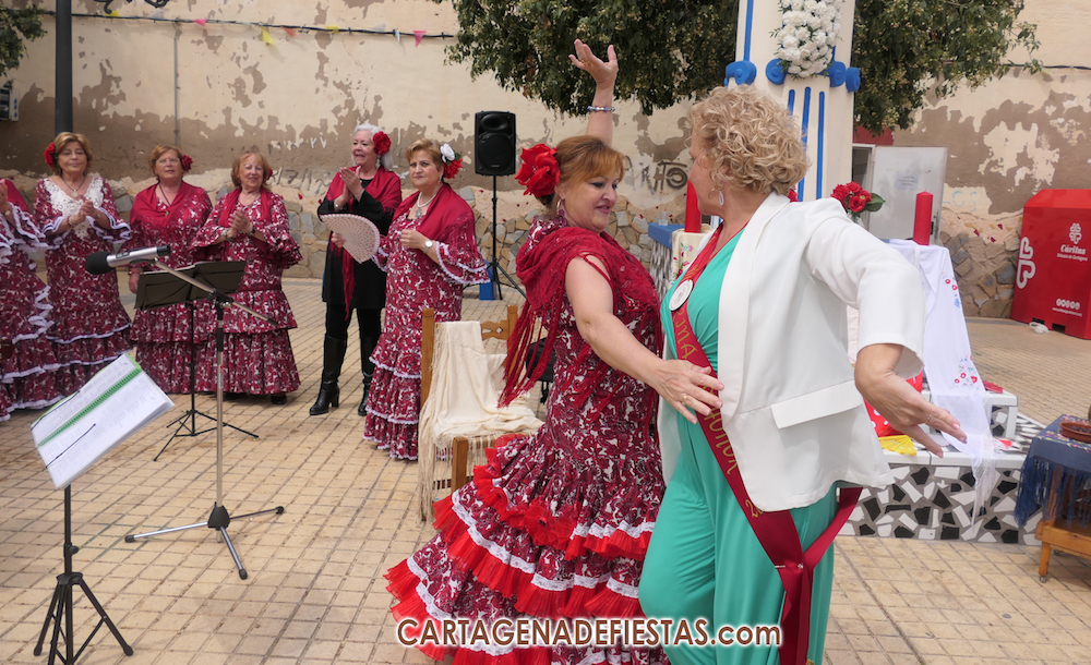La concejala Paqui Martínez Sotomayor, después de recibir la distinción de la hermandad de romeros de San Antón, se marcó unas sevillanas con una de las integrantes del coro rociero 'Alba'.