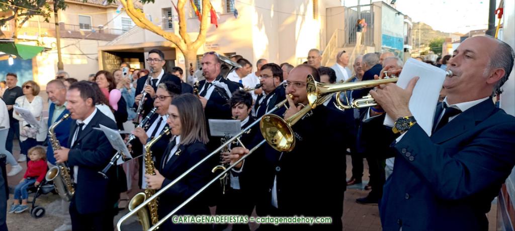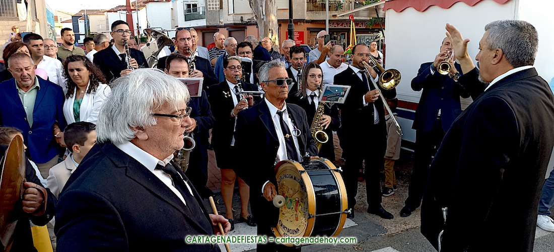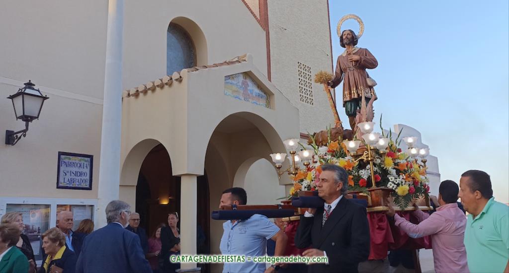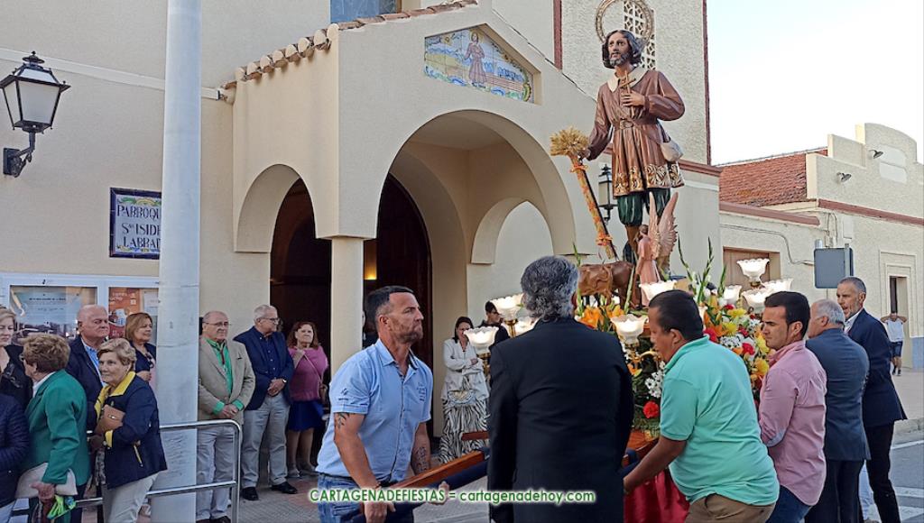Escasos minutos después de las ocho y media de la tarde, comenzaba a escucharse frente a la fachada de la iglesia el himno de España, interpretado por la Agrupación ‘Cartagena 1990’. Ese sonido, junto al de repique de campanas, anunciaba que San Isidro Labrador volvía a las calles de su pueblo después de un año. Una traca completaba el júbilo del momento.