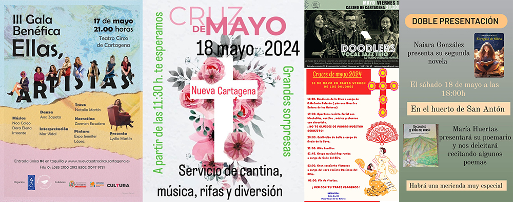 La actividad social de ocio va mucho más de 'La noche de los museos' en el territorio cartagenero este fin de semana, pues también hay fiestas en Pozo Estrecho, cruces de mayo en Los Dolores, Nueva Cartagena y La Loma del Albujón, semanal cultural en Galifa, procesión en Barriada de Hispanoamérica, presentación de libro en el huerto de San Antón, gala 'Ellas', ruta de la tapa en La Palma, jazz en el Casino de Cartagena...