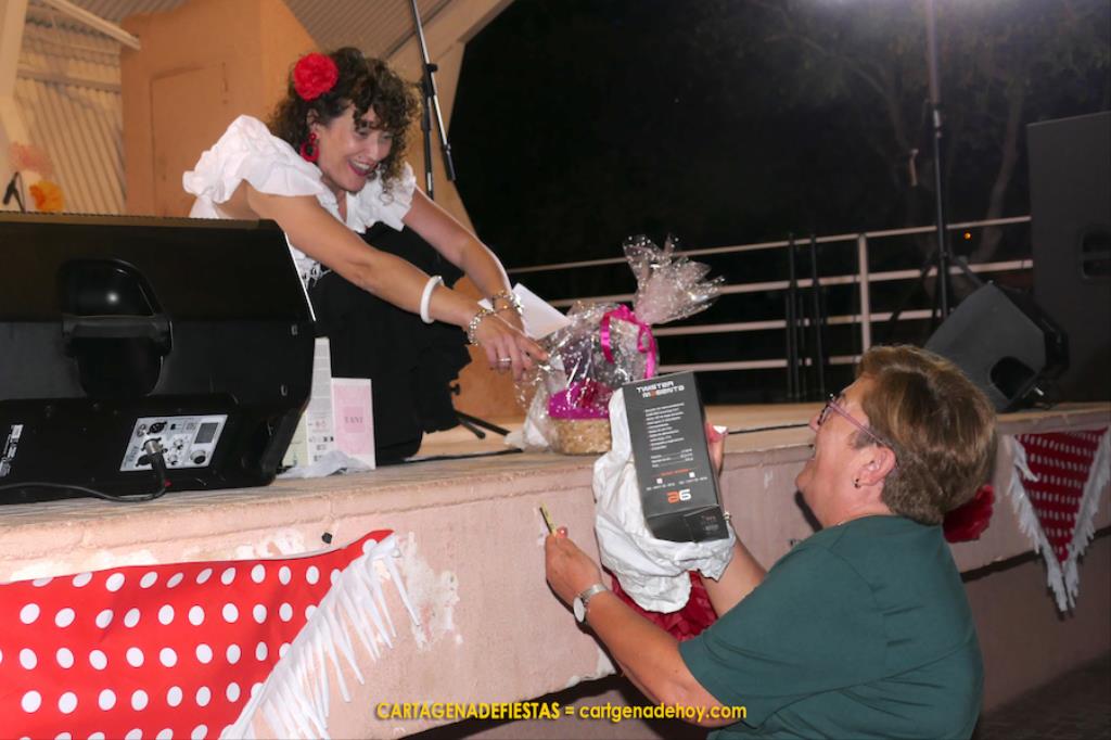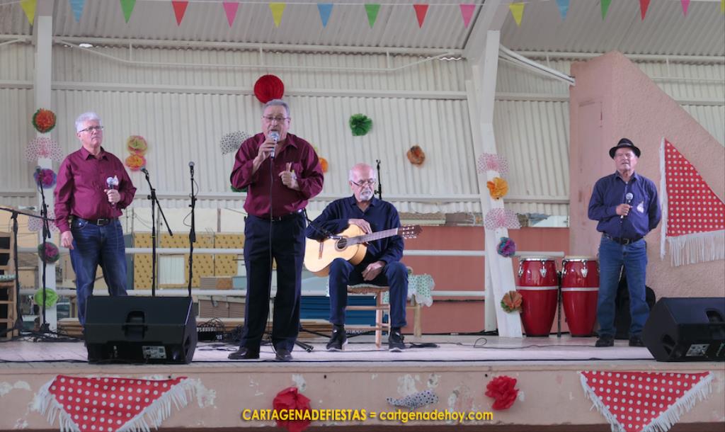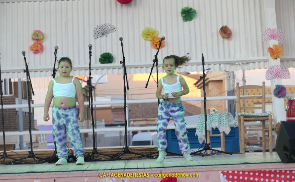 Las chicas de diferentes edades de la escuela de baile de Rocío de la Cova (en el centro en la foto situada sobre estas líneas) ofreceron varias coreografías, para a continuación tener lugar una muestra trovera que tuvo entre sus participantes a un vecino de Los Dolores, Juan Santos 'El Baranda'.