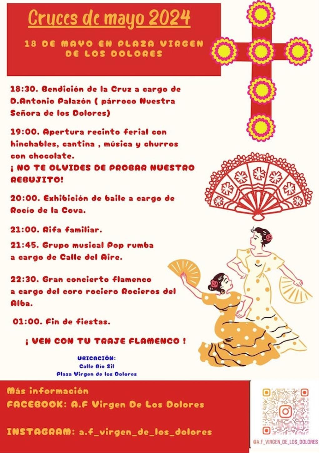 Antes tuvo lugar la bendición de la floreada cruz a cargo del párroco de Nuestra Señora de los Dolores, Antonio Palazón, y la apertura de las barras y churrería, que tuvieron una gran actividad todas las horas, al igual que los hinchables para los más pequeños. Entre los asistentes estuvieron (que viéramos y fotografiáramos) a la presidenta de la Junta Vecinal Municipal, Julia Otón (con vestuario rociero), y a los vocales Sergio Sánchez (PP) y Antonio Pardo (PSOE), además de directivos de la asociación de vecinos.
