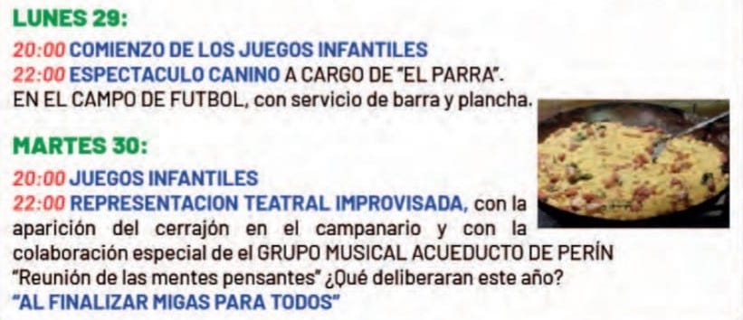 Las fiestas patronales de Perín siguen su buena marcha, que entre otras actividades, celebró el domingo la degustación popular de un arroz popular en el campo de fútbol en lugar de la plaza de la Iglesia, como figuraba en el programa. Hay que matizar que este año son dos los recintos que albergan las fiestas.