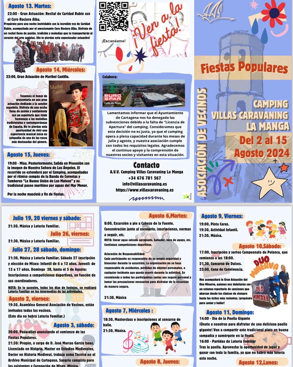 Los festejos populares de la asociación de vecinos del cámping comienzan este sábado con un pasacalles y el pregón de José Marcos García Isaac. Después habrá diversas actuaciones musicales, excursiones, concursos, arroz gigante y actividades infantiles hasta el 15 de agosto, cuando salga en procesión Nuestra Señora de los Ángeles. Antes, mañana, se celebra asamblea general. Los organizadores plasman en el folleto de fiestas que el Ayuntamiento de Cartagena les ha denegado las subvenciones por la falta de licencia de apertura del complejo, lo que no consideran justo.