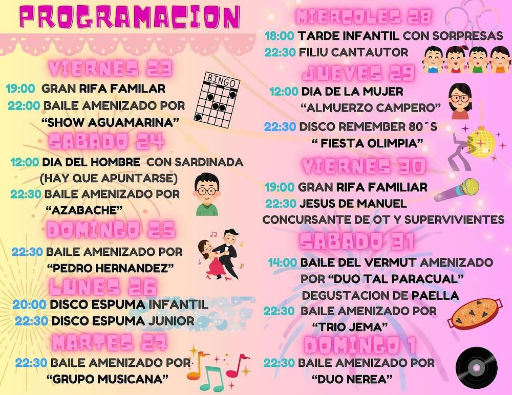 La barriada cartagenera celebrará sus festejos del viernes 23 de agosto al domingo uno de septiembre con un programa diseñado por la asociación de vecinos con claro protagonismo de los bailes con música en directo ('Aguamarina', 'Azabache', Pedro hermández, 'Musicana', Filiú, Fiesta Olimpia jesús de Manuel, 'Jema' y 'Nerea') y la gastronomía con sardinada, almuerzo campero y arroz gigante.
