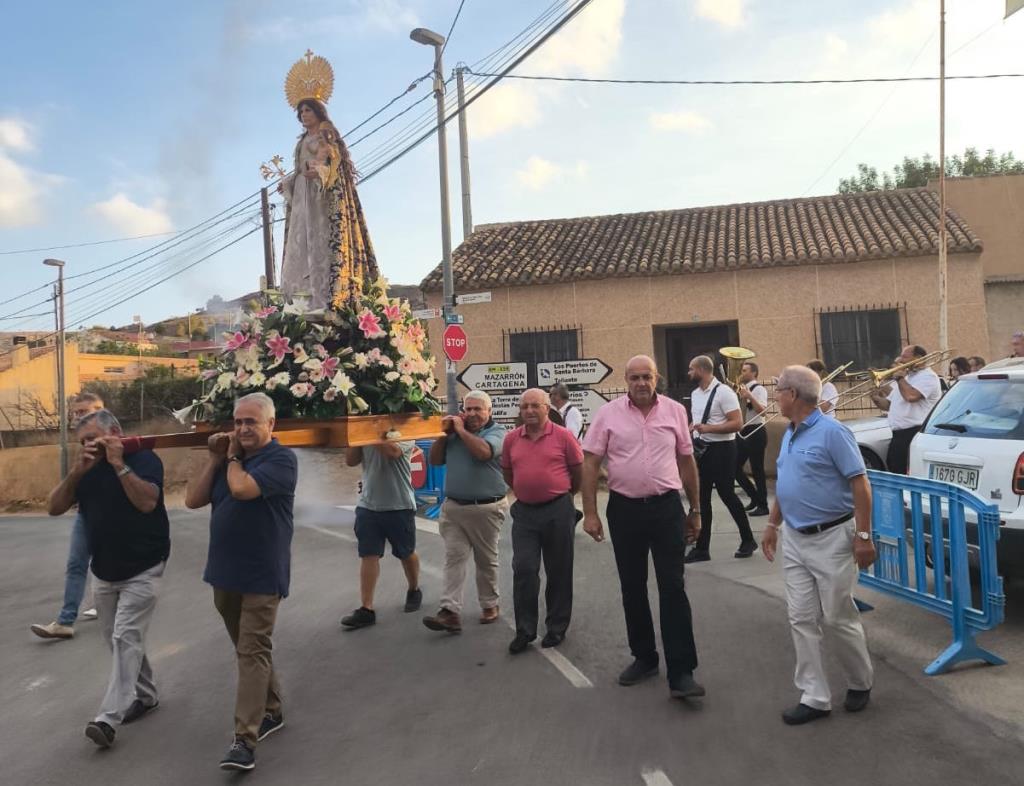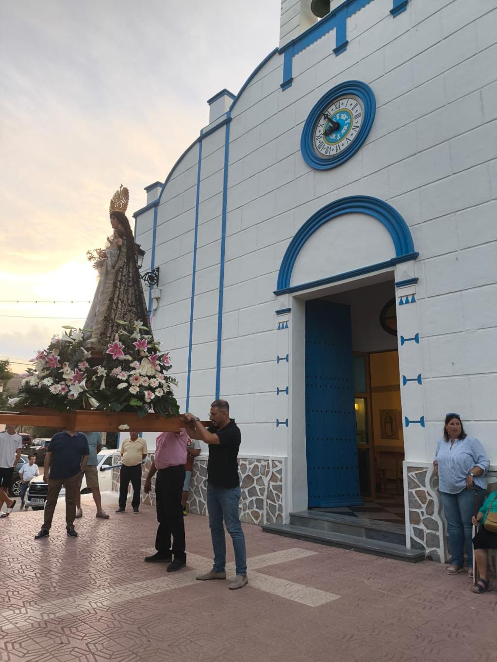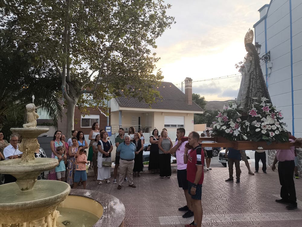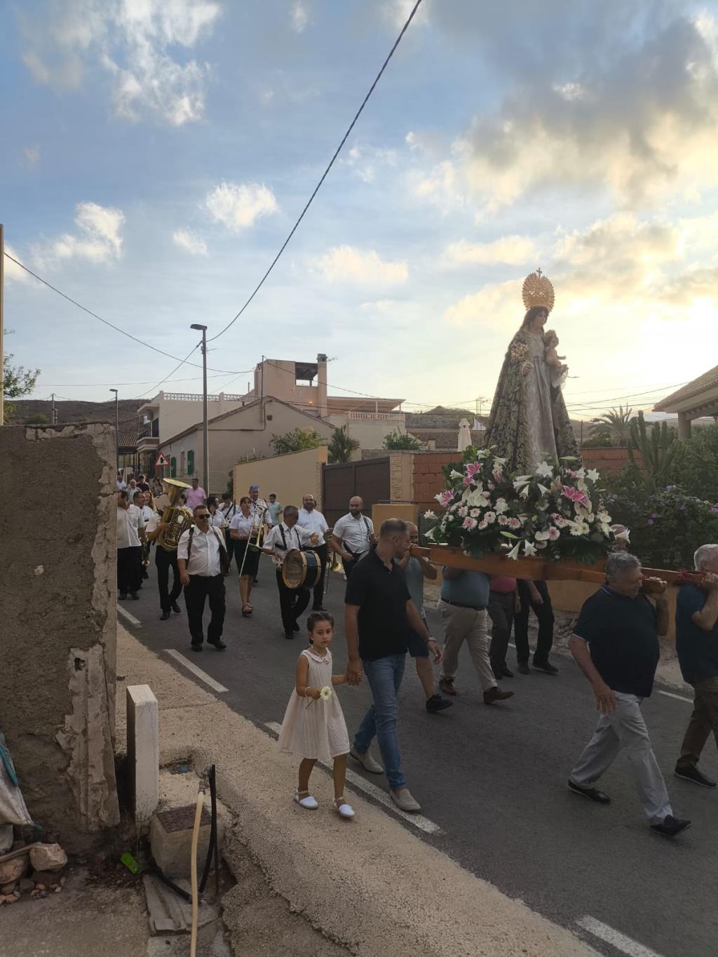 La 'madre' de los perineros protagonizó la jornada final de unas fiestas patronales que arrancaron el 20 de julio. La imagen presidió por la mañana una eucaristía en su honor que fue enriquecida por los sonidos de la 'Rondalla el Acueducto' y por la tarde, con el acompañamiento de la Agrupación Musical 'Cartagena 1990', recorrió diferencias calles y vías del pueblo, junto a sus devotos.