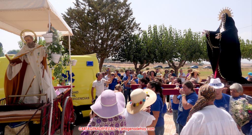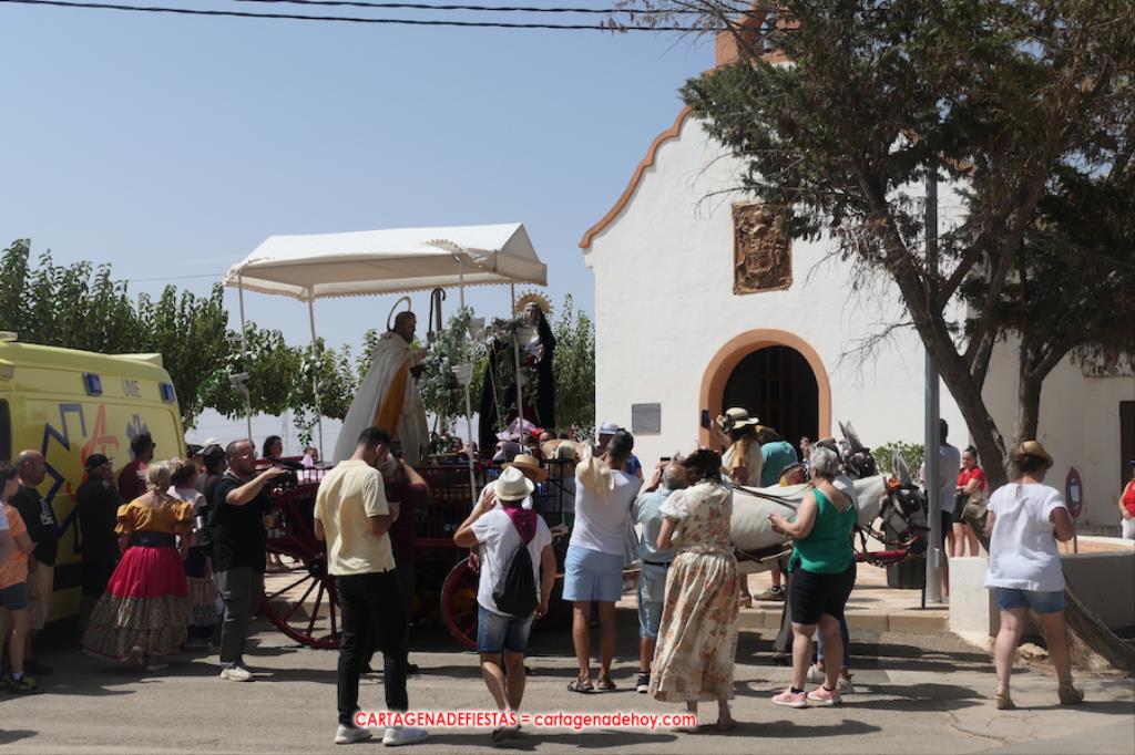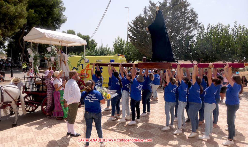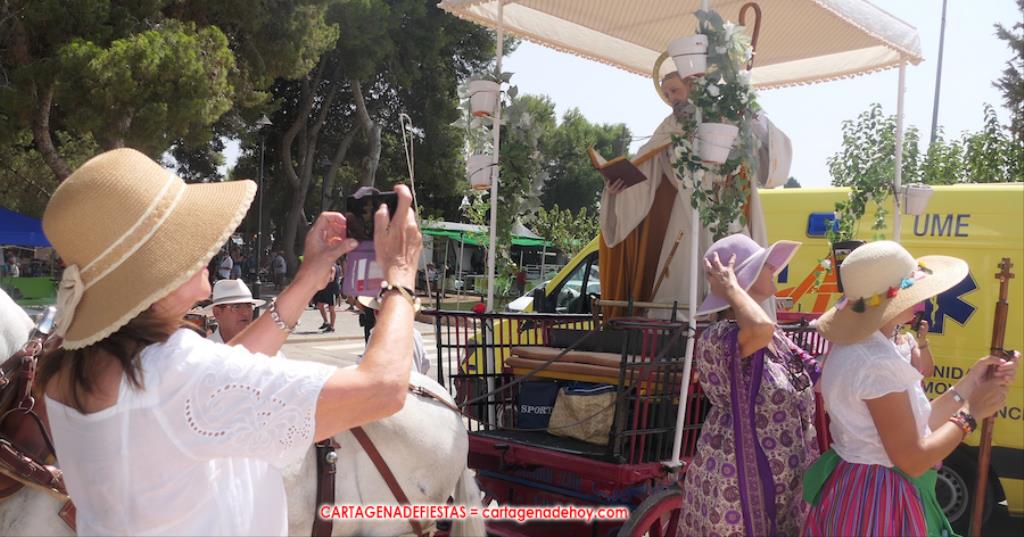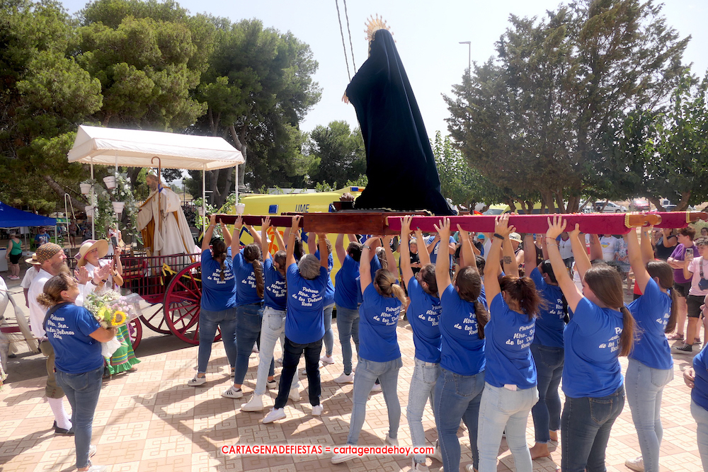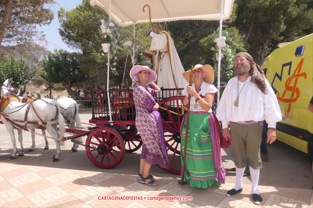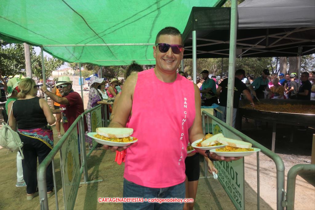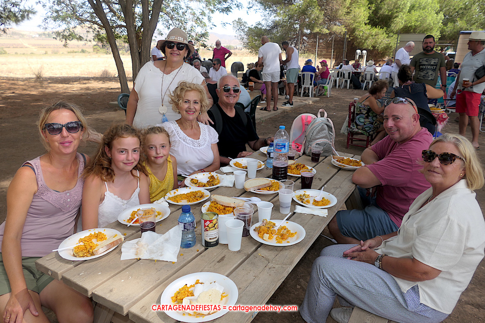 Karma21 ofrece escenas de la llegada de los romeros a la ermita unionense de Roche, donde el santo patrono cartagenero fue recibido por la Virgen de los Dolores y en cuya pinada tuvo lugar una gran convivencia en torno a un gigantesco arroz que culminó con cafe de puchero, desencadenándose durante ese alto varias 'batallas de agua'.
