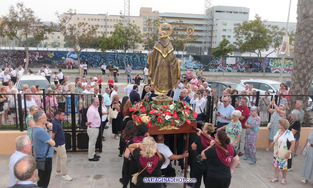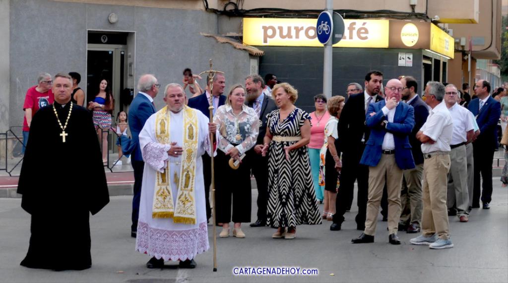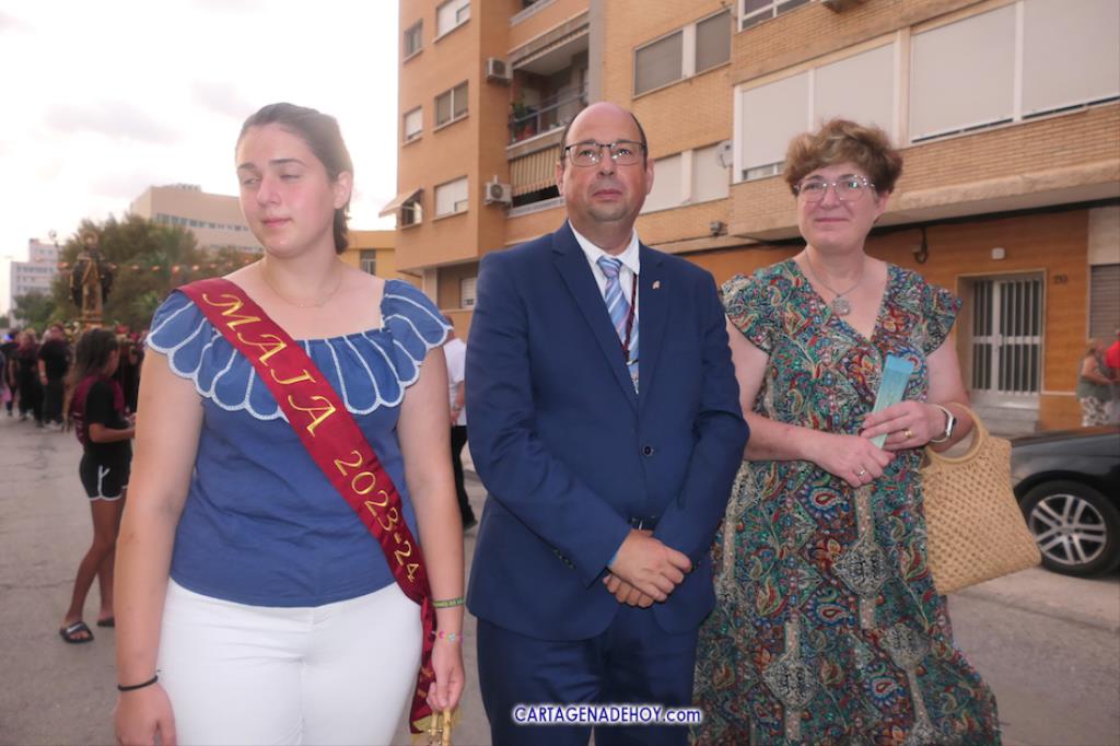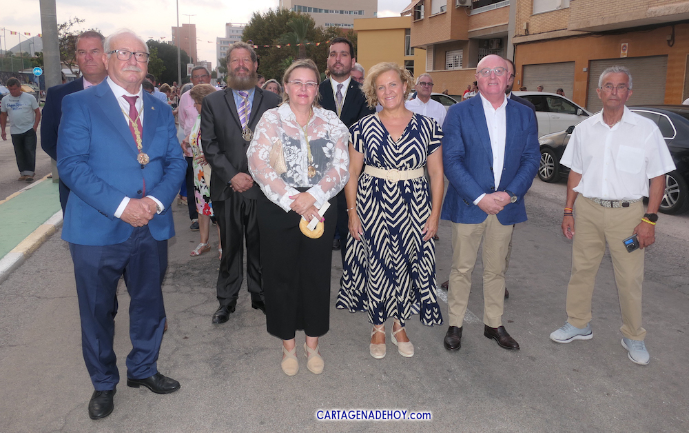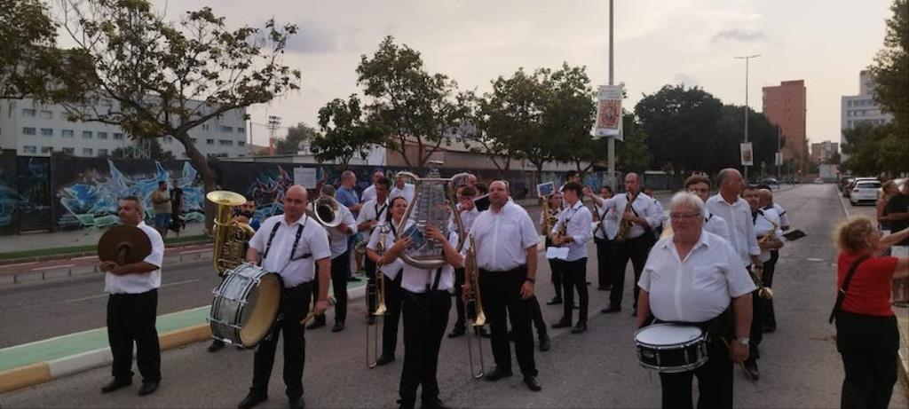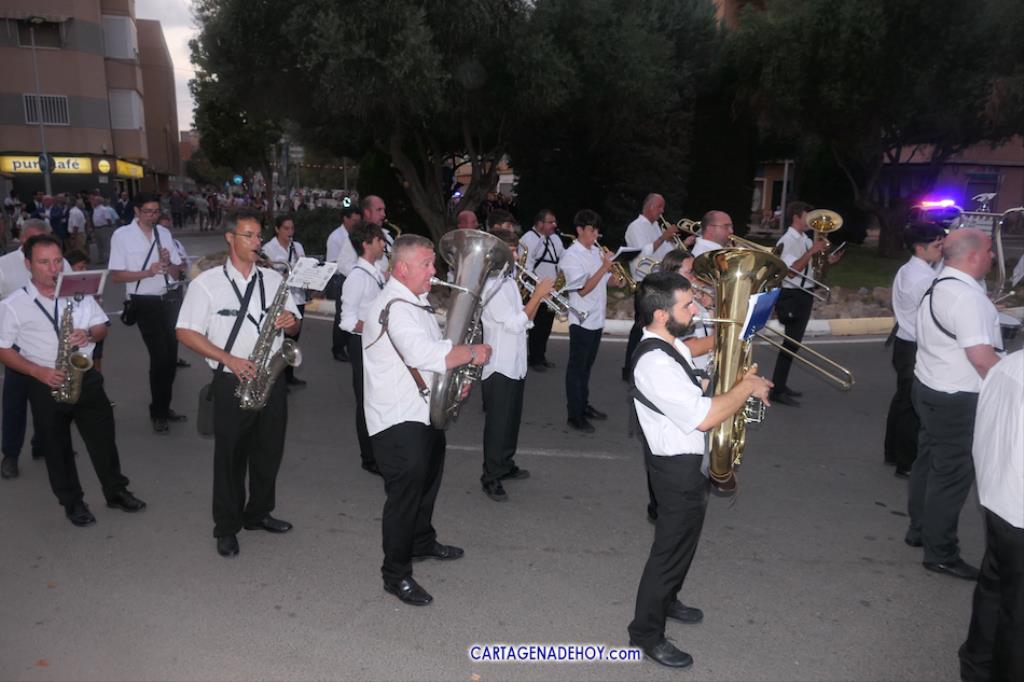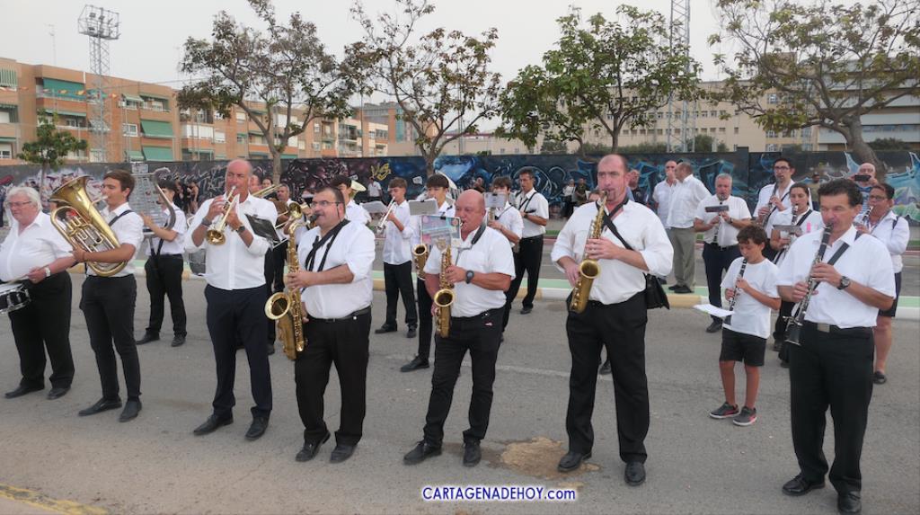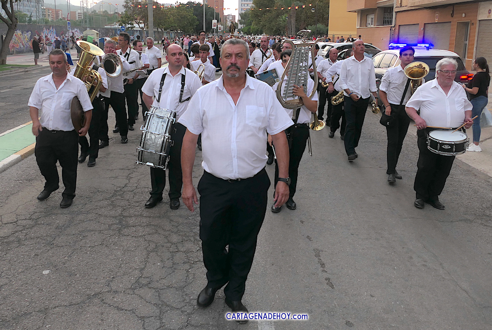 La otra novedad ha estado en la presencia de la Agrupación Musical 'Cartagena 1990', que ha recibido a la imagen haciendo sonar el himno de España y que después ha abierto la marcha por las calles de la barriada, por detrás del estandarte.