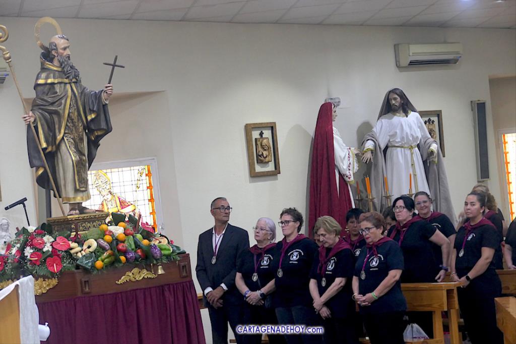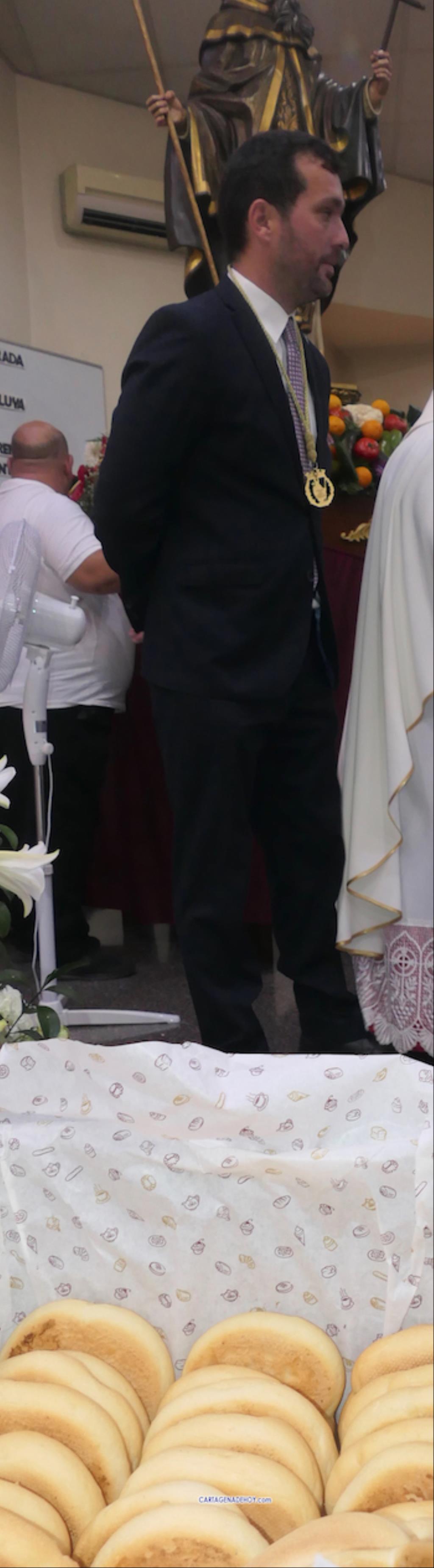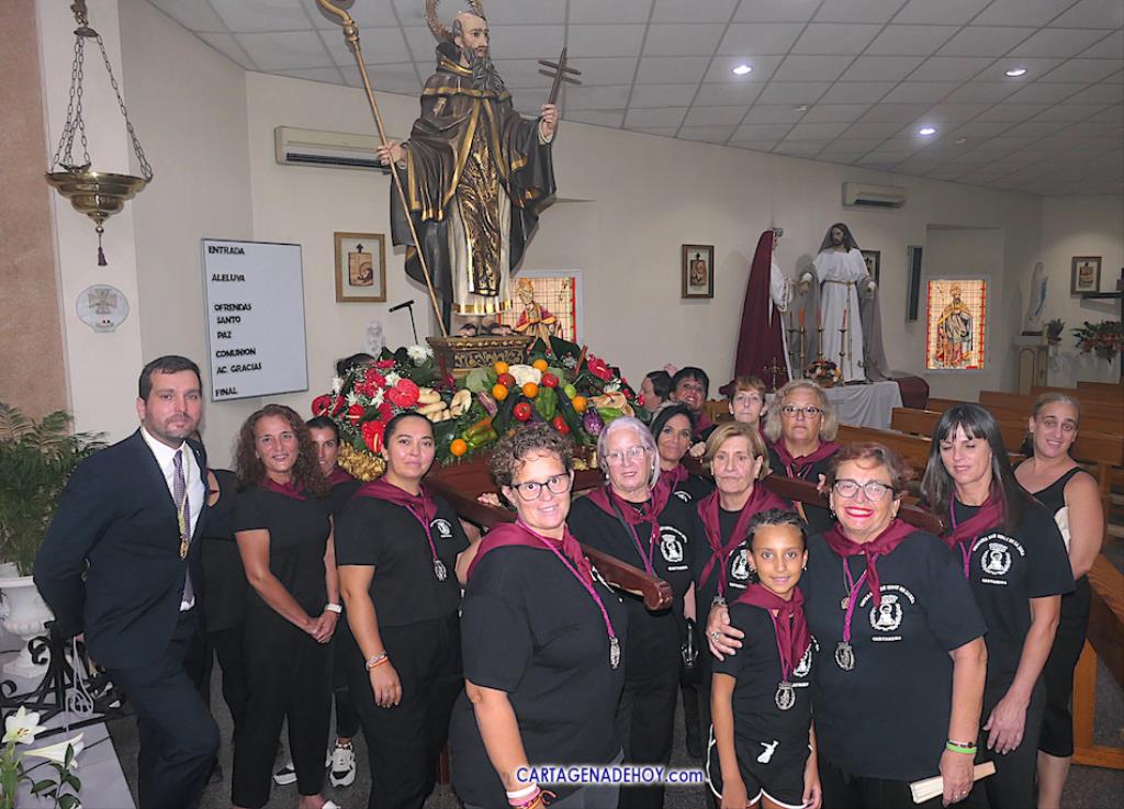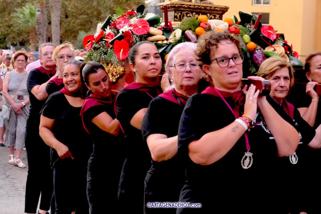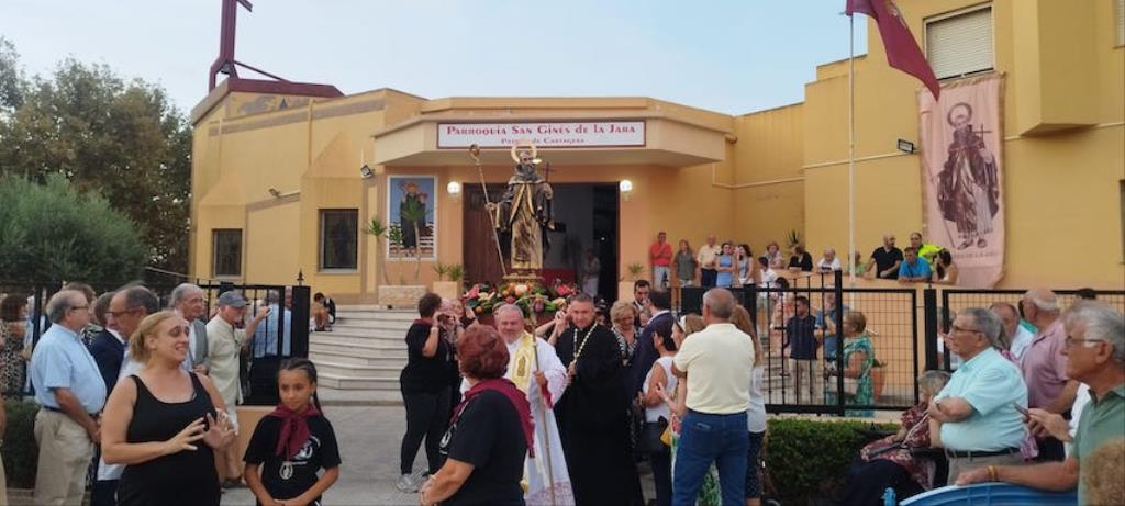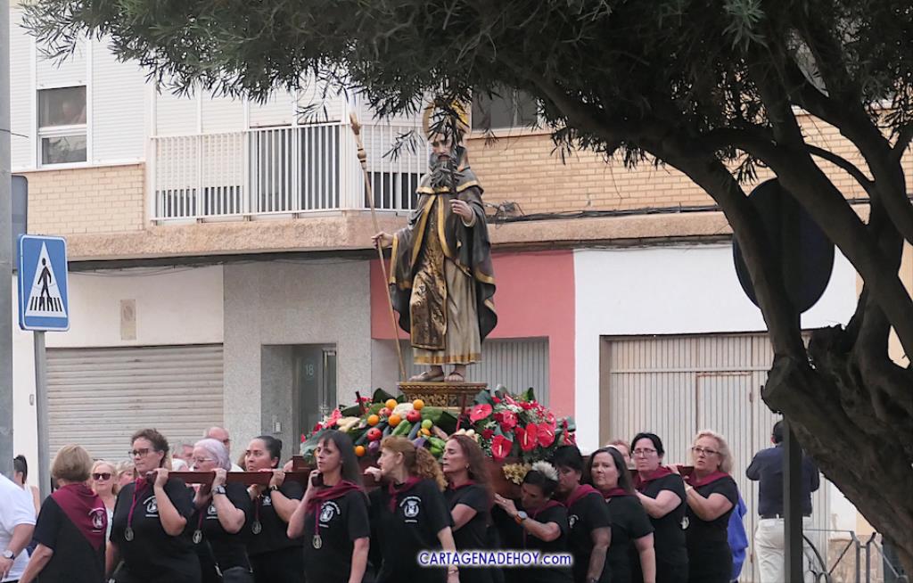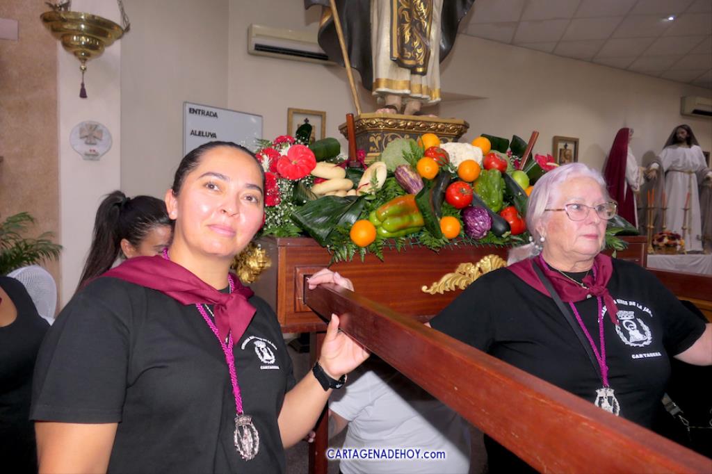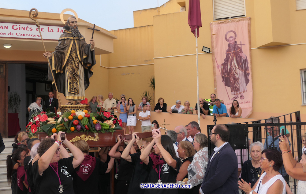 Tomates, pepinos, pimientos, naranjas y otras verduras, además de los rollicos del santo, forman desde hace dos años el frontal de la peana que lleva en procesión a San Ginés de la Jara. Todos son productos naturales, completándose el adorno con la flor de 'anthurium'.