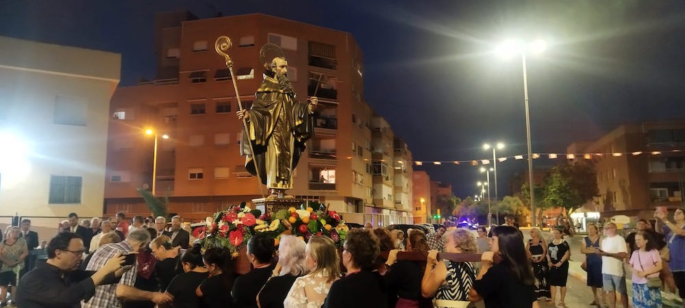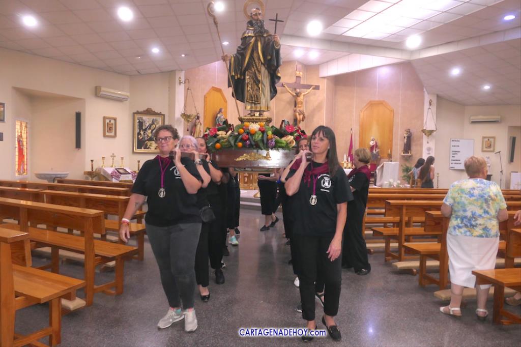Este año, en la procesión, ha sido novedad la configuración de la base del trono, lo que ha dado más visibilidad a las frutas y verduras (aportadas por la frutería 'En punto'), además de los rollicos, que van a los pies del santo ermitaño.