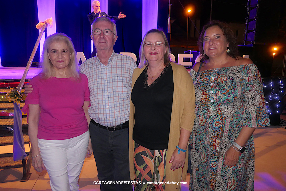 La hermana mayor de la Cofradía del Resucitado de Cartagena aparcó este cargo procesionista para plasmar en el pregón de apertura de la fiestas patronales cómo vino a este pueblo de forma provisional y acabó cautivada por lo que después fue su “pueblo adoptivo”, en el que residió quince año y al que esperar regresar en breve. En la foto se la observa con Francisco Martínez, presidente de la asociación de vecinos