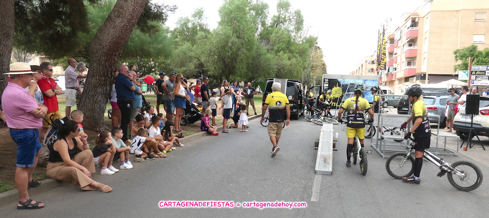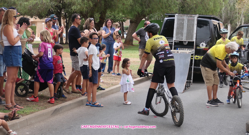 Una representación de la escuela de trialbici que dirige el dos veces campeón del mundo Daniel Cegarra ha llevado a cabo esta mañana, en un tramo de la avenida de Venecia de la barriada de Cartagena Norte y dentro de sus fiestas populares, una muestra de la habilidad adquirida por sus alumnos que ha sido del agrado del público asistente. Por la tarde, el grupo ciclista se ha dirigido a Yepes (Toledo), donde han sido contratados para otra actuación.