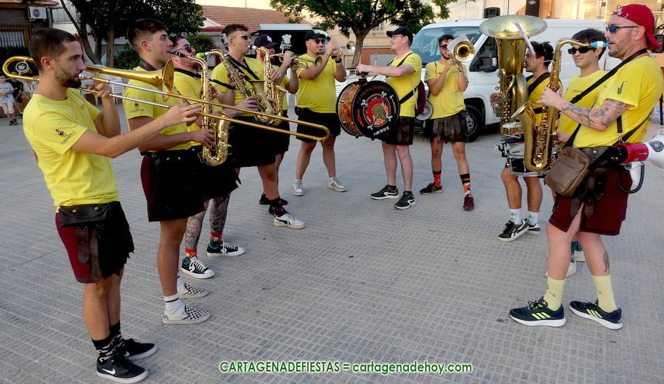 Las fiestas dolorenses contaron por vez primera con un grupo de animación, previo a la apertura del recinto festero, recorriendo las calles del barrio para convocar a los vecinos. En la foto, la 'Tropachequera' con la comisión de fiestas.