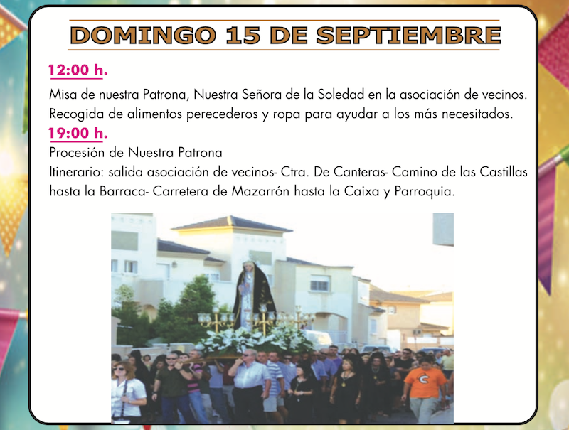 Los Dolores y El Algar siguen inmersos en sus festejos con amplias propuestas para este fin de semana, mientras que en Molinos Marfagones tendrá lugar este domingo la misa y procesión con la patrona. Además, hoy hay flamenco en el restaurante Mare Nostrum y la representación de 'La reina del baile' a beneficio del Banco de Alimentos de la Región de Murcia.