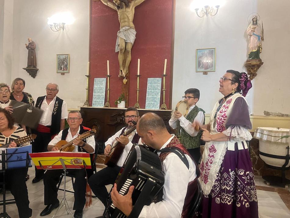 El grupo de coros y danzas Virgen de los Dolores enriqueció con sus voces, música y vestuarios la eucaristía que se celebró en la iglesia del populoso barrio cartagenero, donde hoy se celebra el día de la patrona, que tendrá su momento álgido con la procesión de la tarde (20 horas).