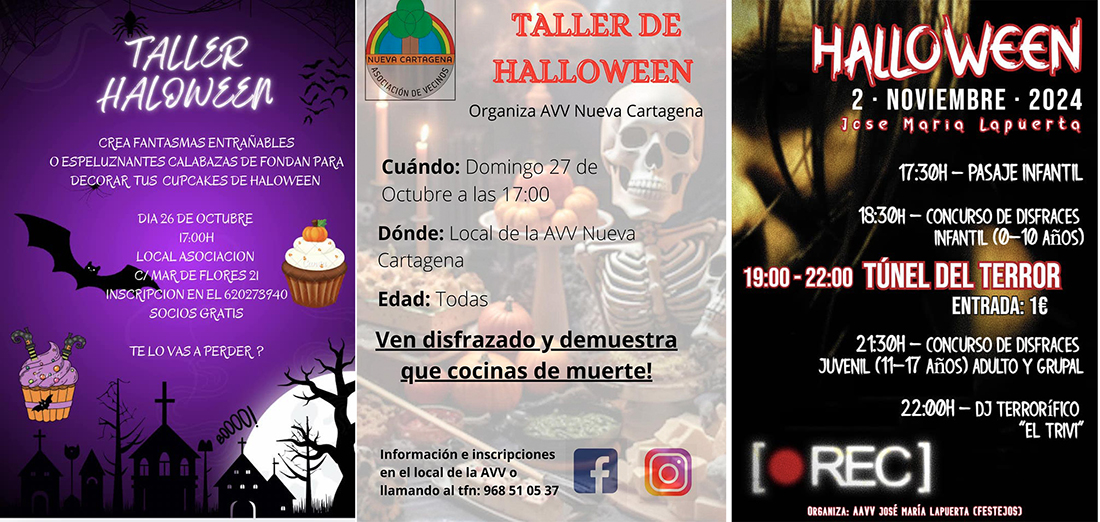 La popular y norteamericana fiesta del terror sigue con actividades a lo largo del municipio cartagenero, como los talleres que tendrán lugar en Bahía Bella este sábado y el domingo en Nueva Cartagena, además del túnel del terror en José María Lapuerta para el 2 de noviembre. En los tres casos organizan las respectivas asociaciones de vecinos.