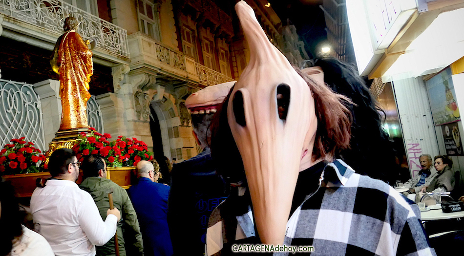 El sábado por la noche se celebraron dos procesiones en el casco histórico de Cartagena y coincidieron con la promoción de una fiesta que un local del puerto prepara para el 31 de octubre con motivo de ‘Halloween’, lo que propició escenas tan curiosas como la que muestra la imagen con San Judas Tadeo pasando junto a un personaje de ‘Bitelchús’.