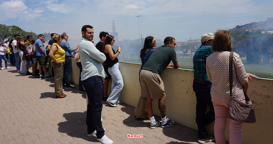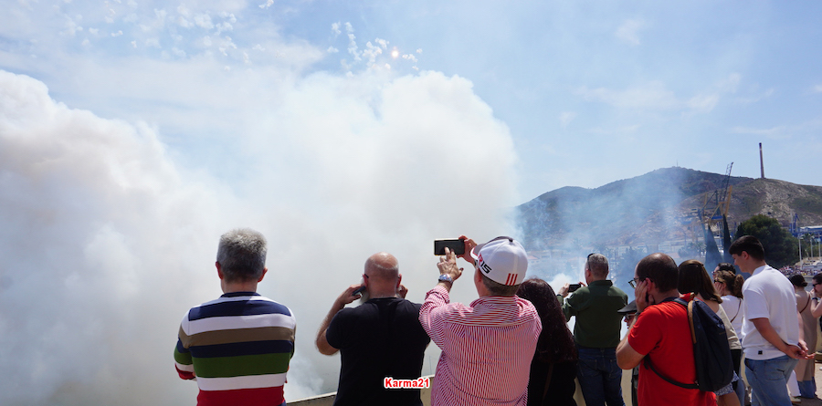 La primera mascletá que tiene lugar en Cartagena ha sido breve e intensa, pues es un acto fallero que suele durar pocos minutos, pero muy intensos. Las explosiones han comenzado de forma más suave, incluso con un bonito color rosado, para después coger carrerilla e ir aumentando la potencia, la sucesión y el humo. Ha gustado tanto a los cientos de espectadores (la mayoría valencianos) que lo han presenciado. A buen seguro que, con el boca-oído, este domingo la cifra de nativos asistentes será mucho mayor para la mascletá de 350 de pólvora que estallarán durante 7 minutos.