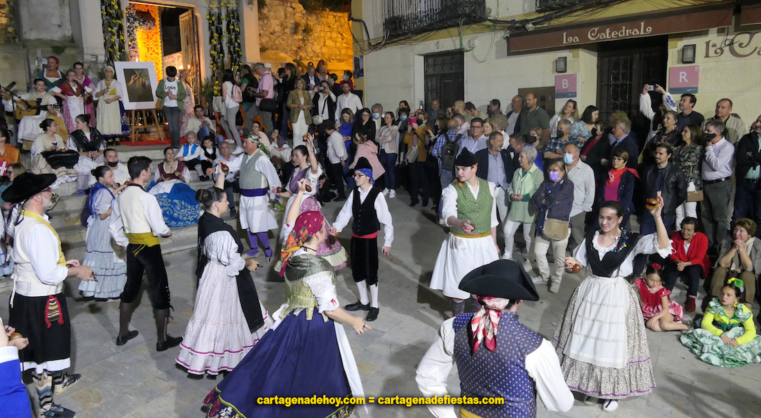 La fiesta cuenta con más de una decena de instalaciones de Cruces de Mayo, que están ubicadas en callejón de Bretau, calles Aire y Palas, y las plazas del Rey, Icue, San Francisco, Ayuntamiento, Risueño y Condesa de Peralta. En esta última ubicación, situada a los pies del Teatro Romano y la Cuesta de la Baronesa, tiene lugar la Cruz de Mayo más costumbrista, de la mano del Grupo Folclórico Ciudad de Cartagena de La Palma. Allí hay programados el sábado por la tarde talleres infantiles, pasacalles, muestras de baile y canto tradicional; y como colofón, la actuación del Grupo Folclórico a las 21:30 horas.
