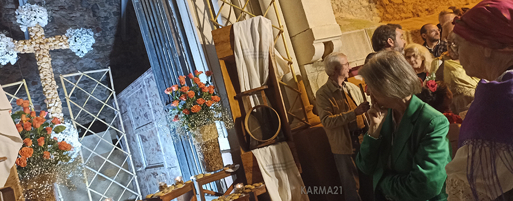 Caracoles, tostones, cristales, rastrojos… y otros han sido los elementos utilizados en las primeras 13 presencias. En 2024 apostaron por la cruz con garrofa o algarroba (los dos términos son correctos, pero en esta tierra es más usual el primero), adornadas con rosas amarillas. ¿Y este año qué se les ocurrirá?, se preguntaban bastantes visitantes días antes, quedando, una vez más, cautivados con las margaritas blancas y rollicos, con polvorones también aunque en menor proporción. Era un homenaje del grupo que preside Pedro Gómez a aquellas encuentros vecinales y familiares en torno a esos dulces caseros con vino dulce que tanto potenciaron las relaciones humanas en los campos de Cartagena.
