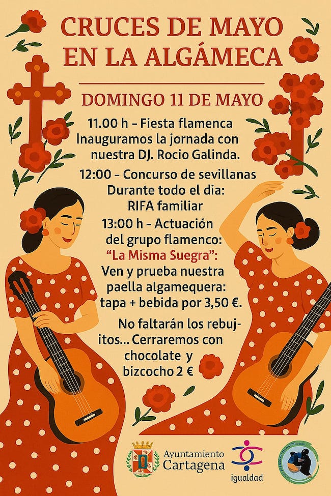 La Algameca Chica celebrará por primera vez la festividad de las Cruces de Mayo. Será este domingo día 11 a partir de las 11:00 horas comenzando con la bendición de la Cruz. Acto seguido, se dará paso al pregón que correrá a cargo de Juan Francisco Rebollo. A las 11:15 la DJ Rocío Galinda amenizará la fiesta pinchando música flamenca, rociera, rumbas y ritmos análogos.A las 12:00 horas habrá un concurso de sevillanas y, posteriormente, actuará el grupo flamenco ‘La Misma Suegra’ mientras se servirá la típica ‘paella algamequera’ a un precio de 3.50 €, que incluirá tapa y bebida. Asimismo, no faltarán los rebujitos. También habrá rifa familiar. Al finalizar la jornada se servirá chocolate y bizcocho a 2 € la ración.