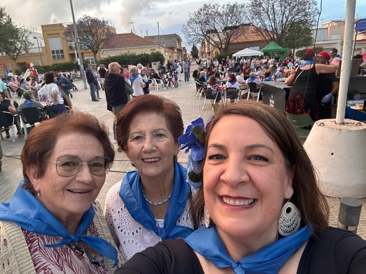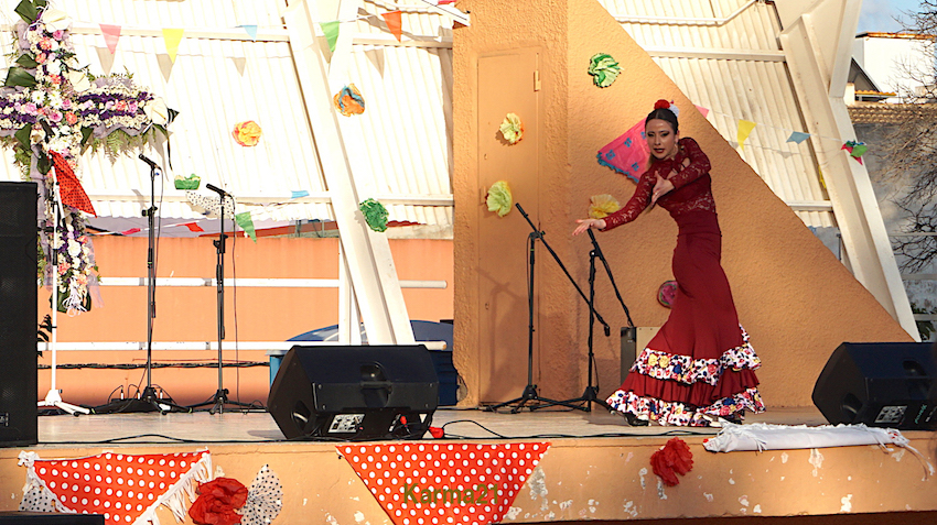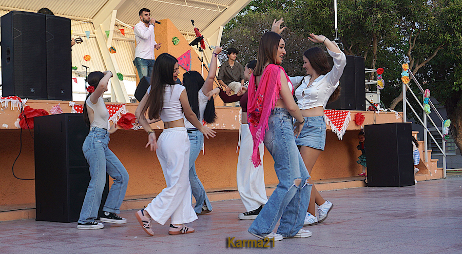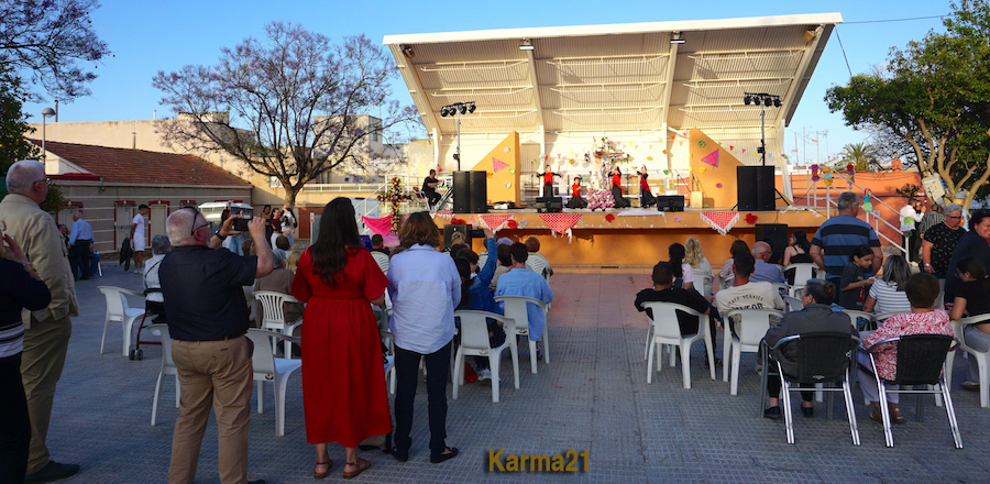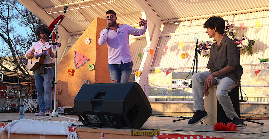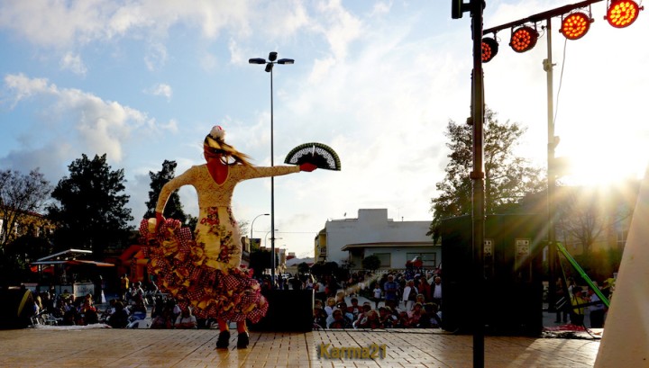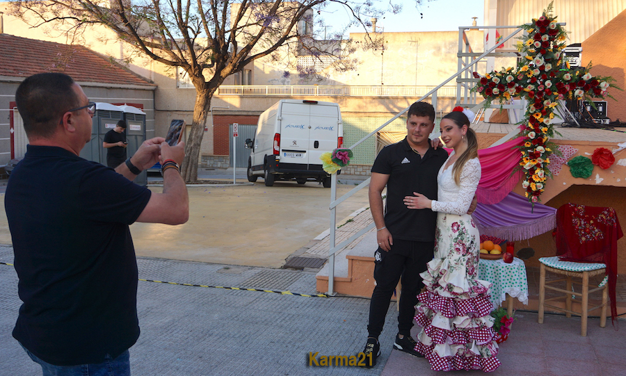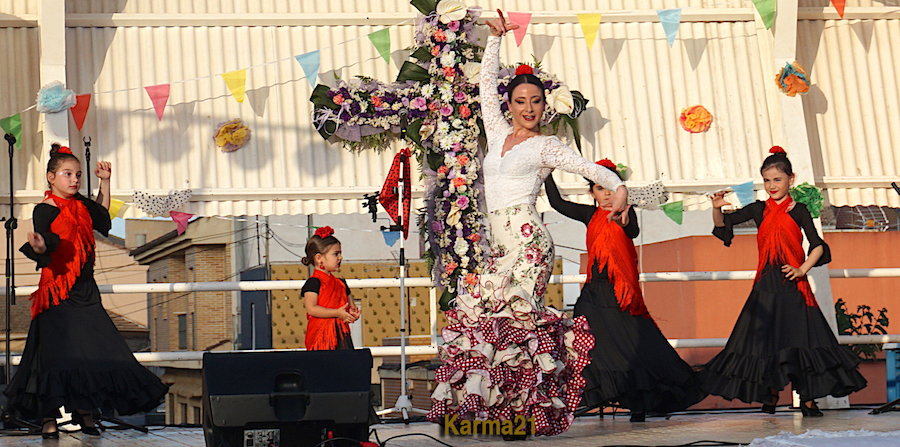 La floreada celebración organizada por la comisión de fiestas en la plaza de la Virgen de los Dolores atrajo a varios cientos de personas para disfrutar de unas propuestas, que incluyeron el baile por sevillanas de Rocío de la Cova y sus alumnas, además de alegre música flamenca de 'Calle del aire'. Hoy es el turno para la floreada fiesta en Barriada de Hispanoamérica.