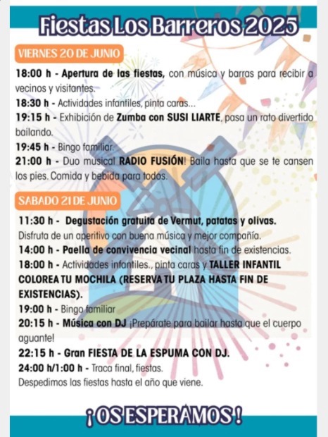 Los festejos populares se celebran hoy y mañana en a plaza ubicada frente a la iglesia con varias propuestas musicales, además de exhibición de zumba, actividades infantiles, rifa familiar, taller de colorear la mochila, fiesta de la espuma y, entre otras, degustación gratuita de vermú, patatas y oliva, además de un un arroz para la convivencia vecinal del domingo.